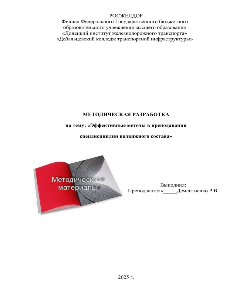 РОСЖЕЛДОР Филиал Федерального Государственного бюджетного образовательного учреждения высшего образования «Донецкий институт железнодорожного транспорта» «Дебальцевский колледж транспортной инфраструктуры» МЕТОДИЧЕСКАЯ РАЗРАБОТКА на тему: «Эффективные методы в преподавании спецдисциплин подвижного состава» Выполнил: Преподаватель_____Дементиенко Р.В. 2025 г. 1 План 1. Введение 2 2. Анализ современного состояния вопроса 2 3. Основные принципы организации учебного процесса 3 4. Методы и формы обучения 4 5. Использование инновационных педагогических технологий 5 6. Организация контроля знаний 6 7. Рекомендации по созданию благоприятной учебной среды 7 8. Заключение 8 9. Список интернет-ресурсов 9 2 1. Введение Современная железнодорожная отрасль предъявляет высокие требования к квалификации персонала, особенно тех специалистов, чья деятельность связана с эксплуатацией и техническим обслуживанием подвижного состава, в частности локомотивов. Железнодорожный транспорт является одним из ключевых элементов инфраструктуры государства, обеспечивая надежность перевозок пассажиров и грузов, безопасность движения поездов и экономическое развитие регионов. Именно поэтому подготовка высококвалифицированных кадров становится приоритетной задачей профессиональных образовательных учреждений. Рост интенсивности грузопотоков, увеличение скорости передвижения составов, внедрение новейших технических решений требуют от выпускников глубоких теоретических знаний и уверенного владения практическими навыками. Современному специалисту необходимы глубокие знания устройства подвижного состава, принципов функционирования всех его узлов и агрегатов, умение диагностировать неисправности и оперативно устранять возникающие неполадки. Без достаточного уровня подготовки невозможно обеспечить бесперебойную эксплуатацию техники, своевременное выполнение ремонтных работ и поддержание высокого уровня надежности транспортных средств. Преподаватели специализированных дисциплин играют ключевую роль в формировании компетенций будущих профессионалов. От того, насколько эффективно будут организованы лекции, практические занятия и стажировки, зависит уровень подготовки молодых специалистов. Только глубокое понимание структуры и особенностей эксплуатации локомотивов позволит будущим специалистам успешно справляться с возникающими проблемами, поддерживать высокий уровень технической готовности подвижного состава и обеспечивать безопасность перевозочного процесса. Для достижения высоких результатов необходим комплексный подход к обучению, включающий использование современных образовательных технологий, создание реалистичных моделей практических ситуаций, активное вовлечение студентов в исследовательские проекты и систематическую оценку их знаний и навыков. Важно также формировать интерес студентов к будущей профессии, развивать инициативу и творческое мышление, повышать ответственность за качество выполняемых работ. 2. Анализ современного состояния вопроса Современные подходы к обучению студентов специальностям, связанным с эксплуатацией и техническим обслуживанием подвижного состава железных дорог, характеризуются сочетанием традиционных и инновационных методов, направленных на повышение качества образо