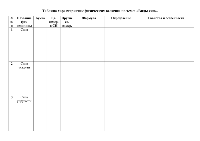 Таблица характеристик физических величин по теме: «Виды сил». № Название п/ физ. п величины Сила 1 2 Сила тяжести 3 Сила упругости Буква Ед. Другие измер. ед. в СИ измер. Формула Определение Свойства и особенности Задача № 1. Определите силу тяжести, действующую: а) на человека массой m = 100 кг; б) на автомобиль массой М = 1,5 т; в) на монет массой m = 5 г. Задача № 2. Какова масса свинцового шара, если он весит 600 Н? Задача № 3. Масса футбольного мяча 400 г. Вычислите вес мяча и силу тяжести, действующую на него.