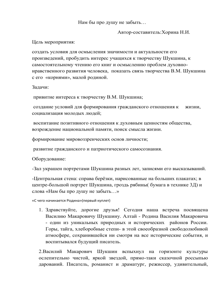 Нам бы про душу не забыть… Автор-составитель:Хорина Н.И. Цель мероприятия: создать условия для осмысления значимости и актуальности его произведений, пробудить интерес учащихся к творчеству Шукшина, к самостоятельному чтению его книг и осмыслению проблем духовнонравственного развития человека, показать связь творчества В.М. Шукшина с его «корнями», малой родиной. Задачи: привитие интереса к творчеству В.М. Шукшина; создание условий для формирования гражданского отношения к социализация молодых людей; жизни, воспитание позитивного отношения к духовным ценностям общества, возрождение национальной памяти, поиск смысла жизни. формирование мировоззренческих основ личности; развитие гражданского и патриотического самосознания. Оборудование: -Зал украшен портретами Шукшина разных лет, записями его высказываний. -Центральная стена: справа берёзки, нарисованные на больших плакатах; в центре-большой портрет Шукшина, гроздь рябины( бумага в технике 3Д) и слова «Нам бы про душу не забыть…» «С чего начинается Родина»(первый куплет) 1. Здравствуйте, дорогие друзья! Сегодня наша встреча посвящена Василию Макаровичу Шукшину. Алтай - Родина Василия Макаровича - один из уникальных природных и исторических районов России. Горы, тайга, хлеборобные степи- в этой своеобразной свободолюбивой атмосфере, сохранившейся ни смотря на все исторические события, и воспитывался будущий писатель. 2.Василий Макарович Шукшин вспыхнул на горизонте культуры ослепительно чистой, яркой звездой, прямо-таки сказочной россыпью дарований. Писатель, романист и драматург, режиссер, удивительный, неповторимый артист, умеющий в самой обыденной интонации сказать такую необходимую правду о простом человеке, что миллионы сердец замирали в едином порыве. Василию Шукшину было дано такое счастье. 1. Родился Василий Шукшин 25 июля 1929 года в большом селе Сростки, расположенном в предгорьях Алтая на правом берегу реки Катуни. Чтец: Разметалось село в предгорьях, Где Катунь расплескалось светло, Знало вдоволь и лиха, и горя Стародавнее это село. Здесь мальчишка торил дорожку, Пьяный ветер вдыхал с лугов, В огороде тяпал картошку, На Катуни тягал чебаков… Край сибирский. Пейзаж неброский. Бьет о берег Катуни волна. Знает каждый в России, что Сростки Это Родина Шукшина. 2. В. М. Шукшин прожил нелегкую жизнь. Детство было трудным, но похожим на жизнь любого крестьянского мальчишки. Родного отца по малолетству Шукшин не запомнил. Шукшин (Юноша в брюках, рубашке старого покроя и кепке). «Фамилия наша происходит от слова "шукша", что значит "волокна, остающиеся от трепания и чесания льна". Отца плохо помню.... Рассказывают, это был огромный мужик, спокойный, красивый... Насчет красоты - трудно сказать. У нас красивыми называют здоровых, круглолицых - «ряшка-во!... Он был какой-то странный человек. Я пытаюсь по рассказам восстановить его характер и не могу - очень противоречивый характер. А может, не было еще никакого характера он был совсем молодой, когда его «взяли»- двадцать два года...В 1933году отец арестован, дальнейшую его судьбу не знаю. В 1956 году он посмертно полностью реабилитирован». 1. Что же случилось с отцом Васи? В те далекие 30-е годы одна бумажка могла изменить жизнь.Тогда в Сибири, в горах Алтая еще орудовали банды, которые имели в некоторых селах своих пособников. Этим и воспользова