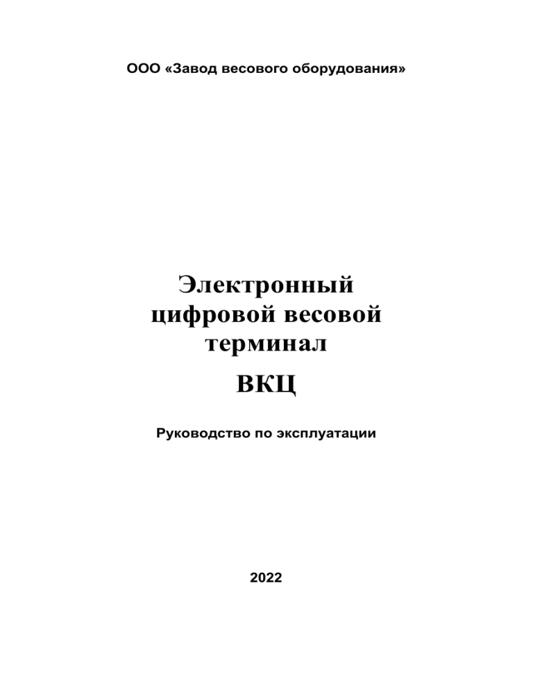 ООО «Завод весового оборудования» Электронный цифровой весовой терминал ВКЦ Руководство по эксплуатации 2022 Руководство по эксплуатации Содержание 1. ОБЩИЕ ПОЛОЖЕНИЯ ...............................................3 2. НАЗНАЧЕНИЕ .............................................................3 3. ТЕХНИЧЕСКИЕ ХАРАКТЕРИСТИКИ.........................3 4. КОМПЛЕКТНОСТЬ .....................................................5 5. УКАЗАНИЕ МЕР БЕЗОПАСНОСТИ. .........................5 6. УСТАНОВКИ И СОЕДИНЕНИЯ..................................6 7. РАБОТА .......................................................................9 8. НАСТРОЙКА ПОДКЛЮЧЕНИЯ ДАТЧИКОВ. ..........10 9. ЮСТИРОВКА УГЛОВ ...............................................15 10. КАЛИБРОВКА. ..........................................................18 11. БЫСТРАЯ КАЛИБРОВКА ПО ДВУМ ТОЧКАМ. .....21 12. БЫСТРАЯ КАЛИБРОВКА ПО ТРЕМ ТОЧКАМ. .....22 13. УСТАНОВКА ДИАПАЗОНОВ ПЕРЕМЕННОЙ ДИСКРЕТНОСТИ ...............................................................23 14. КОРРЕКТИРОВКА КАЛИБРОВКИ ..........................25 15. СООБЩЕНИЯ, ВЫВОДИМЫЕ НА ДИСПЛЕЙ .......26 16. ТАБЛИЦА ПАРАМЕТРОВ И КАЛИБРОВОЧНЫХ КОЭФФИЦИЕНТОВ...........................................................27 ООО «Завод весового оборудования» 2 Руководство по эксплуатации 1. Общие положения Настоящее руководство по эксплуатации удостоверяет гарантированные предприятием–изготовителем основные параметры и характеристики электронного цифрового весового терминала ВКЦ (далее по тексту - терминал). Перед эксплуатацией внимательно ознакомьтесь с настоящим документом. 2. Назначение Терминал предназначен для: преобразования сигнала датчиков или ЦНП в вес; отображения результатов взвешивания; обмена информацией с другими устройствами по последовательному каналу связи в соответствии со стандартами RS-232 и RS-485. 3. Технические характеристики Цифровой интерфейс связи с ЦНП Режим связи RS485 Сигнальное расстояние передачи ............................ ≤1000м Скорость в бодах передачи ...................... 9600, 19200 бит/с Питание DC...................................................................... 10V Возможность подключения до 16 тензодатчиков Дисплей 7 цифр СИД, 7 секций символов состояния прибора. Клавиатура Цифровые клавиши ........................................................ 0 - 9 Функциональные клавиши 30 шт. (10 из 30 объединены с числовыми клавишами) Часы, календарь Год, месяц, дата, час, минута, секунды, автоматическое определение високосного года и количества дней в месяце 3 ООО «Завод весового оборудования» Руководство по эксплуатации Интерфейс дублирующего табло Последовательный режим передачи, Токовая петля, RS232; Скорость в бодах передачи ...................................... 600 бит/с; Последовательный интерфейс Последовательный режим передачи ................ RS232/RS485; Скорость в бодах: ................. 600/1200/2400/4800/9600/19200; Температура хранения, С ....................................... -25 ÷ +55; Относительная влажность, % (при 25 С) ................ ≤85%RH; Размеры, мм ....................................................... 339×110×230; Вес, кг ....................................................................................3,7. Метрологические характеристики Метрологическая характеристика Класс точности по ГОСТ OIML R 76-1– 2011 Значение доли предела допускаемой погрешности, pi: Максимальное число поверочных интервалов, n: - однодиапазонные весы - в каждом диапазоне взвешивания многодиапазонных весов Напряжение питания датчиков, Uexc, В Линия связи Максимальное значение отношения длины кабеля к поперечному сечению, (L/A)max, м/мм2 Диапазон уравновешивания тары, % от максимальной нагрузки весов (Max) Значение III 0,0 3000 3000 5,0 четырех- или шестипроводная 274 100 ООО «Завод весового оборудования» 4 Руководство по эксплуатации Основные техн
