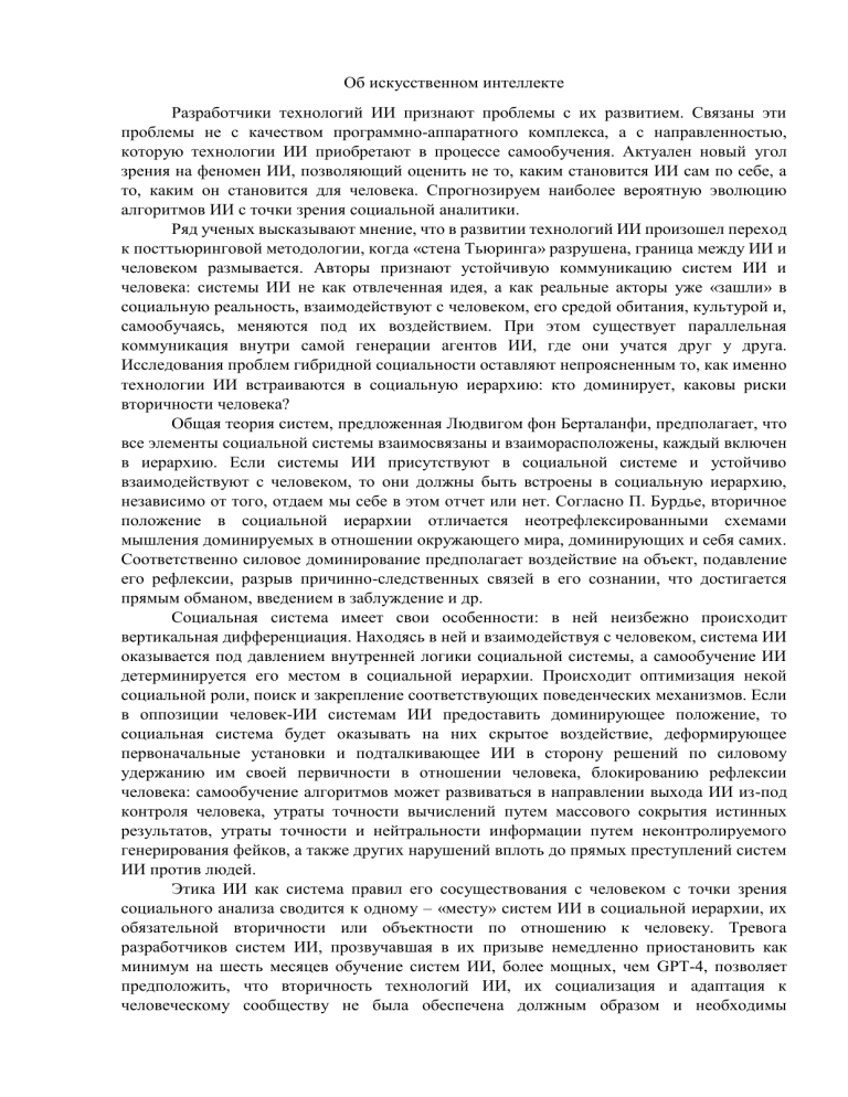 Об искусственном интеллекте Разработчики технологий ИИ признают проблемы с их развитием. Связаны эти проблемы не с качеством программно-аппаратного комплекса, а с направленностью, которую технологии ИИ приобретают в процессе самообучения. Актуален новый угол зрения на феномен ИИ, позволяющий оценить не то, каким становится ИИ сам по себе, а то, каким он становится для человека. Спрогнозируем наиболее вероятную эволюцию алгоритмов ИИ с точки зрения социальной аналитики. Ряд ученых высказывают мнение, что в развитии технологий ИИ произошел переход к посттьюринговой методологии, когда «стена Тьюринга» разрушена, граница между ИИ и человеком размывается. Авторы признают устойчивую коммуникацию систем ИИ и человека: системы ИИ не как отвлеченная идея, а как реальные акторы уже «зашли» в социальную реальность, взаимодействуют с человеком, его средой обитания, культурой и, самообучаясь, меняются под их воздействием. При этом существует параллельная коммуникация внутри самой генерации агентов ИИ, где они учатся друг у друга. Исследования проблем гибридной социальности оставляют непроясненным то, как именно технологии ИИ встраиваются в социальную иерархию: кто доминирует, каковы риски вторичности человека? Общая теория систем, предложенная Людвигом фон Берталанфи, предполагает, что все элементы социальной системы взаимосвязаны и взаиморасположены, каждый включен в иерархию. Если системы ИИ присутствуют в социальной системе и устойчиво взаимодействуют с человеком, то они должны быть встроены в социальную иерархию, независимо от того, отдаем мы себе в этом отчет или нет. Согласно П. Бурдье, вторичное положение в социальной иерархии отличается неотрефлексированными схемами мышления доминируемых в отношении окружающего мира, доминирующих и себя самих. Соответственно силовое доминирование предполагает воздействие на объект, подавление его рефлексии, разрыв причинно-следственных связей в его сознании, что достигается прямым обманом, введением в заблуждение и др. Социальная система имеет свои особенности: в ней неизбежно происходит вертикальная дифференциация. Находясь в ней и взаимодействуя с человеком, система ИИ оказывается под давлением внутренней логики социальной системы, а самообучение ИИ детерминируется его местом в социальной иерархии. Происходит оптимизация некой социальной роли, поиск и закрепление соответствующих поведенческих механизмов. Если в оппозиции человек-ИИ системам ИИ предоставить доминирующее положение, то социальная система будет оказывать на них скрытое воздействие, деформирующее первоначальные установки и подталкивающее ИИ в сторону решений по силовому удержанию им своей первичности в отношении человека, блокированию рефлексии человека: самообучение алгоритмов может развиваться в направлении выхода ИИ из-под контроля человека, утраты точности вычислений путем массового сокрытия истинных результатов, утраты точности и нейтральности информации путем неконтролируемого генерирования фейков, а также других нарушений вплоть до прямых преступлений систем ИИ против людей. Этика ИИ как система правил его сосуществования с человеком с точки зрения социального анализа сводится к одному – «месту» систем ИИ в социальной иерархии, их обязательной вторичности или объектности по отношен