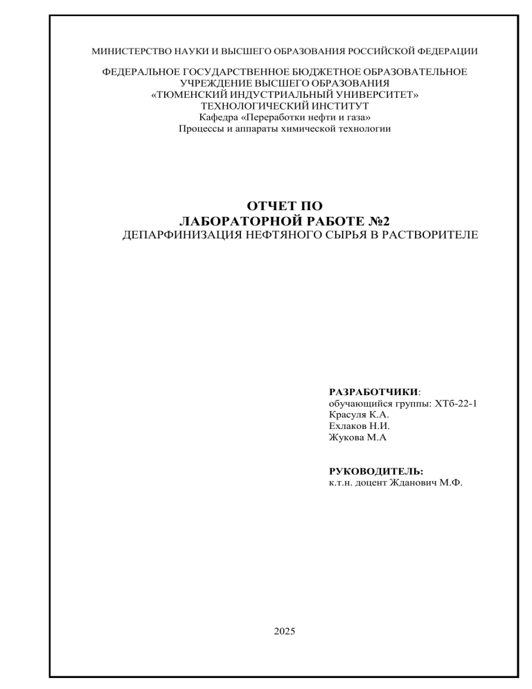 МИНИСТЕРСТВО НАУКИ И ВЫСШЕГО ОБРАЗОВАНИЯ РОССИЙСКОЙ ФЕДЕРАЦИИ ФЕДЕРАЛЬНОЕ ГОСУДАРСТВЕННОЕ БЮДЖЕТНОЕ ОБРАЗОВАТЕЛЬНОЕ УЧРЕЖДЕНИЕ ВЫСШЕГО ОБРАЗОВАНИЯ «ТЮМЕНСКИЙ ИНДУСТРИАЛЬНЫЙ УНИВЕРСИТЕТ» ТЕХНОЛОГИЧЕСКИЙ ИНСТИТУТ Кафедра «Переработки нефти и газа» Процессы и аппараты химической технологии ОТЧЕТ ПО ЛАБОРАТОРНОЙ РАБОТЕ №2 ДЕПАРФИНИЗАЦИЯ НЕФТЯНОГО СЫРЬЯ В РАСТВОРИТЕЛЕ РАЗРАБОТЧИКИ: обучающийся группы: ХТб-22-1 Красуля К.А. Ехлаков Н.И. Жукова М.А РУКОВОДИТЕЛЬ: к.т.н. доцент Жданович М.Ф. 2025 2 Цель работы: Получение и анализ высокоплавких парафиновых углеводородов и нефтяного масла методом низкотемпературной кристаллизации в избирательных растворителях. Краткое описание выполнения работы: 1. В плоскодонной колбе с плотно притертой пробкой приготавливают 100 мл. растворителя смешением ацетона или метилэтилкетона (по заданию преподавателя) с толуолом в соотношении 40:60 % об. 2. На технических весах в другой плоскодонной колбе взвешивают 20 г. рафината и добавляют 60 г. приготовленного растворителя (при кратности разбавления сырье : растворитель 1:3), плоскодонную колбу закрывают с пробкой, оснащенной термометром. 3. Смесь перемешивании растворителя до и полного сырья нагревают растворения на твердых плитке при парафиновых углеводородов, но не выше 50-60 ˚С. 4. Термообработанную смесь помещают в холодильную камеру для охлаждения при перемешивании до температуры фильтрации. Одновременно охлаждают в камере 20 г. растворителя для промывки осадка, (рисунок 2.1). 5. На технических весах взвешивают две пустые круглодонные колбы со шлифами для растворов депмасла и гача. 6. После охлаждения суспензии до заданной температуры (от минус 10 ˚С до минус 20 ˚С) включают вакуум-насос, устанавливают заданную величину вакуума (200-300 мм рт. ст.), помещают в воронку Бюхнера бумажный фильтр, смачивают его небольшим количеством растворителя и Из Лис № докум. Разраб. Провер. Жданович Н. Контр Утв. Под- Да Лабораторная работа №2 Депарафинизация нефтяного сырья в растворителе Лит. Лист 1 Листов 5 ТИУ ТЕХИН гр. ХТБ22-1 3 фильтруют полученную суспензию (рисунок 2.2). После завершения процесса промывают осадок приготовленным количеством охлажденного растворителя. В результате фильтрации на фильтре образуется осадок, состоящий из твердых парафиновых углеводородов с небольшим содержанием раствора (гач), а также фильтрат – представляет собой раствор депарафинированного масла в растворителе. 7. Раствор фильтрата и гача помещают затем в предварительно взвешенные круглодонные колбы и отгоняют растворитель (рисунок 2.3). 8. После отгонки растворителя и охлаждения полученных продуктов, определяют их выход в граммах, а также показатели качества – температуру застывания масла и температуру плавления гача. Методика определения температуры застывания масла: В стеклянную пробирку с рубашкой наливают 4 г. депарафинированного масла, вставляют термометр с пробкой таким образом, чтобы ось термометра располагалась по оси пробирки, а ртутный шарик находился в центре объема масла. Пробирку с термометром и исследуемым образцом масла нагревают на водяной бане до 60 0С, затем охлаждают на воздухе до 35 0С и помещают в холодильную камеру. По достижении предполагаемой температуры застывания пробирку вынимают из камеры и наклоняют ее под углом 45°. Если в течение одной минуты мениск масла не с