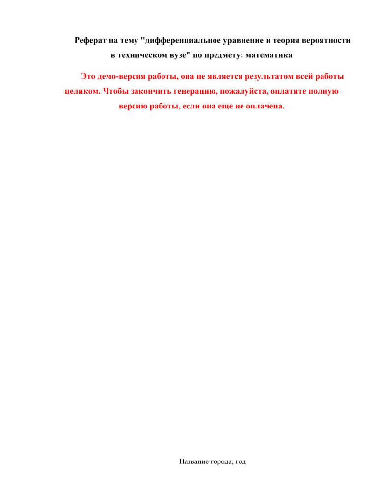Реферат на тему "дифференциальное уравнение и теория вероятности в техническом вузе" по предмету: математика Это демо-версия работы, она не является результатом всей работы целиком. Чтобы закончить генерацию, пожалуйста, оплатите полную версию работы, если она еще не оплачена. Название города, год СОДЕРЖАНИЕ ВВЕДЕНИЕ ОСНОВНАЯ ЧАСТЬ 1. Теоретические основы дифференциальных уравнений и теории вероятности 1.1 Определение и свойства дифференциальных уравнений. 1.2 Основные понятия теории вероятности. 1.3 Применение дифференциальных уравнений и теории вероятности в техническом образовании. 2. Экспериментальное моделирование динамических систем 2.1 Организация экспериментов с использованием дифференциальных уравнений. 2.2 Применение вероятностных методов в моделировании. 2.3 Методы анализа и сбора данных. 3. Анализ и оценка эффективности подходов 3.1 Сравнительный анализ результатов экспериментов. 3.2 Выявление сильных и слабых сторон использования математических инструментов. 3.3 Рекомендации по интеграции в учебный процесс. ЗАКЛЮЧЕНИЕ СПИСОК ЛИТЕРАТУРЫ ПРИЛОЖЕНИЯ 2 ВВЕДЕНИЕ Актуальность исследования темы "Дифференциальное уравнение и теория вероятности в техническом вузе" обусловлена несколькими ключевыми факторами, которые подчеркивают важность и необходимость глубокого изучения этих математических дисциплин в контексте технического образования. Дифференциальные уравнения как математический инструмент, используемый для моделирования динамических систем, и теория вероятности, изучающая закономерности случайных явлений, в контексте их применения в техническом вузе.В современном техническом образовании дифференциальные уравнения и теория вероятности играют ключевую роль в подготовке специалистов. Эти два раздела математики позволяют эффективно моделировать и анализировать сложные системы, что особенно актуально в инженерных и научных дисциплинах. Установить взаимосвязь между дифференциальными уравнениями и теорией вероятности как основными инструментами для моделирования и анализа динамических систем в техническом образовании.Введение в исследование показывает, что дифференциальные уравнения и теория вероятности представляют собой два взаимодополняющих подхода, которые позволяют студентам технических вузов глубже понять и анализировать процессы, происходящие в различных областях науки и техники. Изучение теоретических основ дифференциальных уравнений и теории вероятности, их определения, свойств и применения в контексте технического образования. Организация экспериментов по моделированию динамических систем с использованием дифференциальных уравнений и вероятностных методов, включая выбор подходящих моделей, методов анализа и сбора данных из научной литературы. Разработка пошагового алгоритма для практической реализации экспериментов, включая создание математических моделей, их численное решение и анализ полученных результатов. Оценка эффективности предложенных подходов на основе сравнительного анализа результатов экспериментов, выявление сильных и слабых сторон использования дифференциальных уравнений и теории вероятности в техническом образовании.Заключение реферата подводит итоги проведенного исследования, подчеркивая важность интеграции дифференциальных уравнений и 