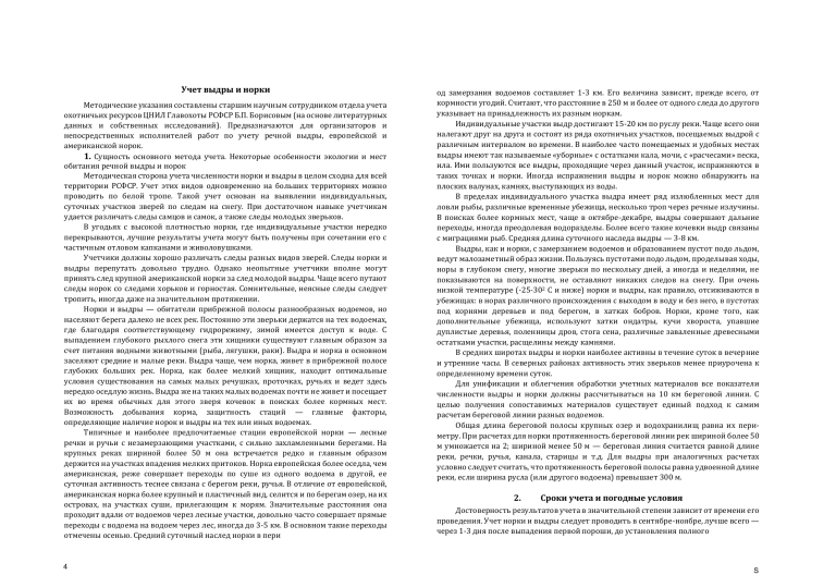 Учет выдры и норки Методические указания составлены старшим научным сотрудником отдела учета охотничьих ресурсов ЦНИЛ Главохоты РСФСР Б.П. Борисовым (на основе литературных данных и собственных исследований). Предназначаются для организаторов и непосредственных исполнителей работ по учету речной выдры, европейской и американской норок. 1. Сущность основного метода учета. Некоторые особенности экологии и мест обитания речной выдры и норок Методическая сторона учета численности норки и выдры в целом сходна для всей территории РСФСР. Учет этих видов одновременно на больших территориях можно проводить по белой тропе. Такой учет основан на выявлении индивидуальных, суточных участков зверей по следам на снегу. При достаточном навыке учетчикам удается различать следы самцов и самок, а также следы молодых зверьков. В угодьях с высокой плотностью норки, где индивидуальные участки нередко перекрываются, лучшие результаты учета могут быть получены при сочетании его с частичным отловом капканами и живоловушками. Учетчики должны хорошо различать следы разных видов зверей. Следы норки и выдры перепутать довольно трудно. Однако неопытные учетчики вполне могут принять след крупной американской норки за след молодой выдры. Чаще всего путают следы норок со следами хорьков и горностая. Сомнительные, неясные следы следует тропить, иногда даже на значительном протяжении. Норки и выдры — обитатели прибрежной полосы разнообразных водоемов, но населяют берега далеко не всех рек. Постоянно эти зверьки держатся на тех водоемах, где благодаря соответствующему гидрорежиму, зимой имеется доступ к воде. С выпадением глубокого рыхлого снега эти хищники существуют главным образом за счет питания водными животными (рыба, лягушки, раки). Выдра и норка в основном заселяют средние и малые реки. Выдра чаще, чем норка, живет в прибрежной полосе глубоких больших рек. Норка, как более мелкий хищник, находит оптимальные условия существования на самых малых речушках, проточках, ручьях и ведет здесь нередко оседлую жизнь. Выдра же на таких малых водоемах почти не живет и посещает их во время обычных для этого зверя кочевок в поисках более кормных мест. Возможность добывания корма, защитность стаций — главные факторы, определяющие наличие норок и выдры на тех или иных водоемах. Типичные и наиболее предпочитаемые стации европейской норки — лесные речки и ручьи с незамерзающими участками, с сильно захламленными берегами. На крупных реках шириной более 50 м она встречается редко и главным образом держится на участках впадения мелких притоков. Норка европейская более оседла, чем американская, реже совершает переходы по суше из одного водоема в другой, ее суточная активность теснее связана с берегом реки, ручья. В отличие от европейской, американская норка более крупный и пластичный вид, селится и по берегам озер, на их островах, на участках суши, прилегающим к морям. Значительные расстояния она проходит вдали от водоемов через лесные участки, довольно часто совершает прямые переходы с водоема на водоем через лес, иногда до 3-5 км. В основном такие переходы отмечены осенью. Средний суточный наслед норки в пери 4 од замерзания водоемов составляет 1-3 км. Его величина зависит, прежде всего, от кормности угодий. Считают, что расстояние в 250 м и более от одного следа