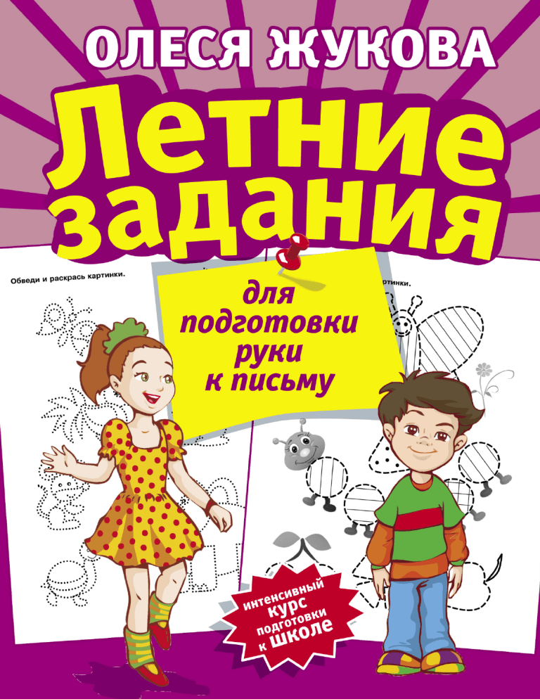 Олеся Жукова Летние задания для подготовки руки к письму Москва Издательство АСТ УДК 372.3/.4 ББК 74.902 Ж86 Серия «Интенсивный курс подготовки к школе» Художники: Е. Беляева, О. Наумова В книге использованы иллюстрации из фотобанка SHUTTERSTOCK: © Bannykh Alexey Vladimirovich/shutterstock, © Danilo Sanino/shutterstock, © IgorijArt/shutterstock, © VanDenBlind/shutterstock, © one line man/shutterstock, © Iamnee/shutterstock, © Igor Zakowski/shutterstock, © Savgraf/shutterstock. Ж86 Жукова, Олеся Станиславовна Летние задания для подготовки руки к письму / О. С. Жукова. — Москва: Издательство АСТ, 2018. — 64 с.: ил. — (Интенсивный курс подготовки к школе). ISBN 978-5-17-106881-3 К моменту поступления в школу ребенок должен уметь правильно держать карандаш или ручку, ориентироваться на листе бумаги. Поэтому любые упражнения, направленные на развитие мелкой моторики, очень полезны для дошкольника. Выполняя задания, собранные в этой книге, ребенок будет обводить и раскрашивать, научится писать буквы и цифры – все это крайне важно для формирования красивого и аккуратного почерка. Для дошкольного возраста. ISBN 978-5-17-106881-3 2 © О. Жукова, 2018 © Е. Беляева, иллюстрации, 2016 © О. Наумова, иллюстрации, 2015 © ООО «Издательство АСТ», 2018 Обведи и раскрась картинки. 3 Обведи и заштрихуй фигуры. 4 Помоги хозяевам найти своих питомцев – распутай поводки. Для большой собаки раскрась поводок синим цветом, для маленькой – зелёным, а для кошки – красным. Нарисуй, как поплывёт пароход. 5 Обведи и раскрась картинки. 6 Продолжи рисовать узоры. Дорисуй картинки. 7 Помоги пауку добраться до паутины, собаке найти косточку, а белке – грибок. Пройди лабиринты – нарисуй линии. 8 Помоги мишке найти малину, зайцу – морковку, а курице – зёрна. Пройди лабиринты – нарисуй линии. 9 Обведи и раскрась картинки. 10 Нарисуй макароны в тарелке, узоры на тарелке, домики улиткам и дырки на сыре. 11 Обведи и раскрась картинки. 12 Дорисуй дорожки для велосипеда, паровоза, машинки, пешехода и зайчика. 13 Обведи и заштрихуй картинки. 14 Обведи и заштрихуй картинки. 15 Дорисуй лучи солнышка, узоры на крыльях бабочек и полоски на носках. 16 Обведи и заштрихуй картинки. 17 Обведи и заштрихуй картинки. 18 Обведи и заштрихуй картинки. 19 Продолжи рисовать картинки. Дорисуй картинки. 20 Продолжи рисовать картинки. Дорисуй картинки. 21 Обведи рисунки по указанным линиям. Старайся не отрывать карандаш от бумаги. 22 Обведи ёлку и игрушки на ней. Дорисуй серпантин. 23 Заштрихуй картинки по направлению, указанному стрелкой. 24 Нарисуй картинки – соедини точки по клеточкам. 25 Обведи рисунки по точкам. Старайся не отрывать карандаш от бумаги. Дорисуй картинки. 26 Обведи рисунки по точкам. Старайся не отрывать карандаш от бумаги. Дорисуй картинки. 27 Обведи картинки, следуя направлению, указанному стрелкой. Старайся не отрывать карандаш от бумаги. Дорисуй картинку. 28 Продолжи рисовать картинки. Дорисуй картинки. 29 Продолжи рисовать картинки. Дорисуй картинки. 30 Обведи узоры. 31 Дорисуй недостающие детали. Продолжи рисовать узоры. 32 Попробуй нарисовать домики двумя руками одновременно. Продолжи рисовать узоры. 33 Нарисуй картинки по образцу. Продолжи рисовать узоры. 34 Попробуй нарисовать лягушку двумя руками одновременно. Продолжи рисовать узоры. 35 Нарисуй по клеточкам. 36 Нарисуй по клеточкам. 37 Нарисуй по клеточкам. 38 Нарисуй по клеточкам. 39 Нарисуй по клеточкам. 40 Нарисуй по клеточкам. 41 Нарисуй по клеточкам. 42 Нарисуй по клеточкам. 43 Нарисуй по клеточкам. 44 На