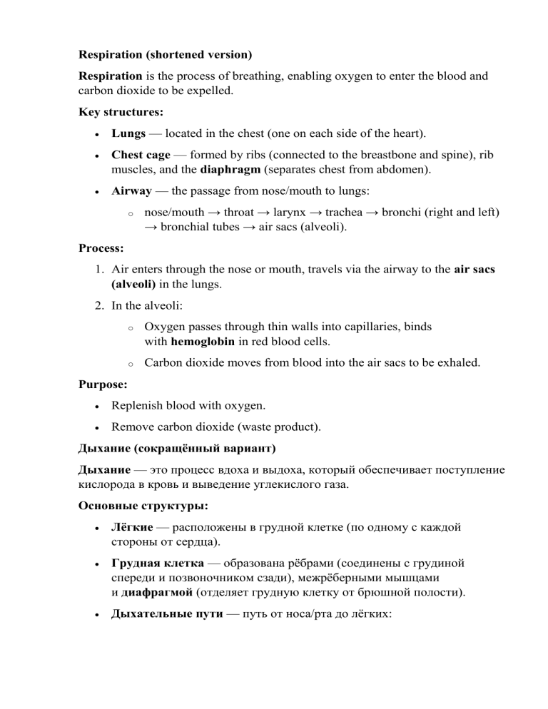 Respiration (shortened version) Respiration is the process of breathing, enabling oxygen to enter the blood and carbon dioxide to be expelled. Key structures: Lungs — located in the chest (one on each side of the heart). Chest cage — formed by ribs (connected to the breastbone and spine), rib muscles, and the diaphragm (separates chest from abdomen). Airway — the passage from nose/mouth to lungs: o nose/mouth → throat → larynx → trachea → bronchi (right and left) → bronchial tubes → air sacs (alveoli). Process: 1. Air enters through the nose or mouth, travels via the airway to the air sacs (alveoli) in the lungs. 2. In the alveoli: o Oxygen passes through thin walls into capillaries, binds with hemoglobin in red blood cells. o Carbon dioxide moves from blood into the air sacs to be exhaled. Purpose: Replenish blood with oxygen. Remove carbon dioxide (waste product). Дыхание (сокращённый вариант) Дыхание — это процесс вдоха и выдоха, который обеспечивает поступление кислорода в кровь и выведение углекислого газа. Основные структуры: Лёгкие — расположены в грудной клетке (по одному с каждой стороны от сердца). Грудная клетка — образована рёбрами (соединены с грудиной спереди и позвоночником сзади), межрёберными мышцами и диафрагмой (отделяет грудную клетку от брюшной полости). Дыхательные пути — путь от носа/рта до лёгких: o нос/рот → глотка → гортань → трахея → бронхи (правый и левый) → бронхиальные трубки → воздушные мешочки (альвеолы). Процесс: 1. Воздух поступает через нос или рот и проходит по дыхательным путям к воздушным мешочкам (альвеолам) в лёгких. 2. В альвеолах: o кислород проникает через тонкие стенки в капилляры и связывается с гемоглобином в эритроцитах; o углекислый газ переходит из крови в воздушные мешочки, чтобы выйти при выдохе. Назначение: насытить кровь кислородом; вывести углекислый газ (продукт жизнедеятельности).