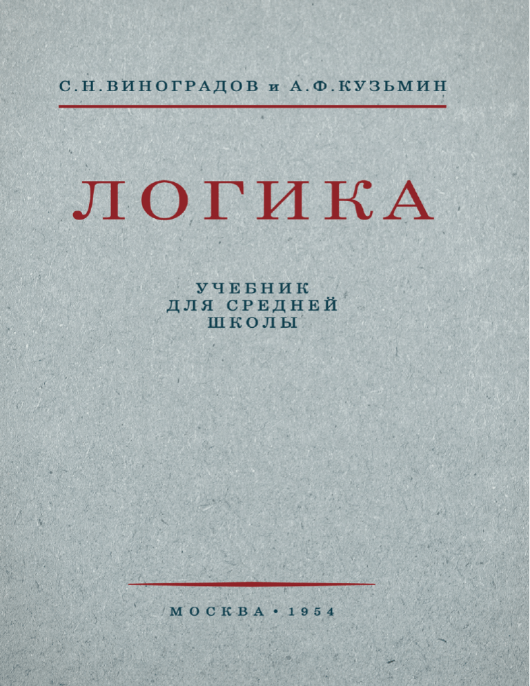 С. Н. ВИНОГРАДОВ и А. Ф. КУЗЬМИН ЛОГИКА УЧЕБНИК ДЛЯ СРЕДНЕЙ ШКОЛЫ Утверждён Министерством просвещения РСФСР ИЗДАНИЕ ВОСЬМОЕ МОСКВА * 1954 От издательства Настоящее (восьмое) издание учебника печатается по седьмому изданию. Глава I ПРЕДМЕТ И ЗАДАЧИ НАУКИ ЛОГИКИ § 1. Логика мышления и наука логика. В труде и в быту, в учебной и общественной работе, в научном трактате и в школьном сочинении — везде и всегда необходимо правильное, т.е. определённое, не­ противоречивое, последовательное, обоснованное, мышление. Без правильного мышления, которое осуществляется с помощью языка, человек не мог бы ни трудиться, ни общаться с другими людьми. Если кто-либо неясно, путано высказывает свои мысли, противоречит самому себе, о таком человеке говорят: «Его нельзя понять, в его рассуждениях нет логики». Здесь словом «логика» называют правильность по­строения мыслей. Правильное построение мыслей изучает­ся наукой логикой. Таким образом, следует различать: 1) логику мышле­ния (правильность построения мыслей) и 2) науку ло­гику1. Кратко науку логику можно определить так: Логика есть наука о законах и формах правильного построения мыслей. § 2. Логические законы и формы. Л о г и ч е с к и е з а к о н ы. Определённость, непротиворечивость, последовательность и обоснованность являются обязательными качествами правильного мыш­ления. Эти качества имеют значение законов правильного мышления. 1 Наименование «логика» происходит от древнегреческого слова «логос», что значит «мышление», «мысль», а также «слово, в кото­ром выражена мысль». 3 Сознательное или несознательное нарушение логических законов ведёт к неправильному выводу. Человек, который нарушает логические законы, неизбежно оказывается побеждённым в споре, дискуссии. Приведём пример. Кто читал роман Тургенева «Рудин», тот помнит горячие споры между двумя героями этого известного произведения. Рассмотрим отрывок из беседы Рудина с Пигасовым: — Прекрасно! — промолвил Рудин. — Стало быть, по-вашему убеждений нет? — Нет — и не существует. — Это ваше убеждение? — Да. — Как же вы говорите, что их нет? Вот вам уже одно, на пер­вый случай. Все в комнате улыбнулись и переглянулись. Легко понять, что Пигасов потерпел поражение. Зная логику, можно определить и характер его ошибки. Пигасов противоречит самому себе. Признав в начале беседы, что убеждений не существует, он тут же отказывается от своей первой мысли и утверждает совершенно противоположное. Один из логических законов, который называется законом противоречия, указывает на недопустимость подобной ошибки в рассуждениях. Логика имеет своей задачей изучение законов правиль­ ного построения мыслей и логических форм. Логическая форма — это структура, строение наших мыслей. Возьмём для примера две такие мысли: Медь — проводник электричества. Пшеница — растение семейства злаковых. Каждая из этих мыслей представляет собой отражение в нашем мышлении определённых фактов действительно­ сти. Так как факты эти различны, то и содержание мыслей об этих фактах различное. Но, несмотря на это, в обоих случаях мы видим общее строение, единую структуру этих мыслей. Наука логика, исследуя логические формы, отвлекается от конкретного содержания той или иной мысли. 4 Рассматривая приведённые примеры, логика интересуется не свойствами меди (ими занимается физика) и не прина