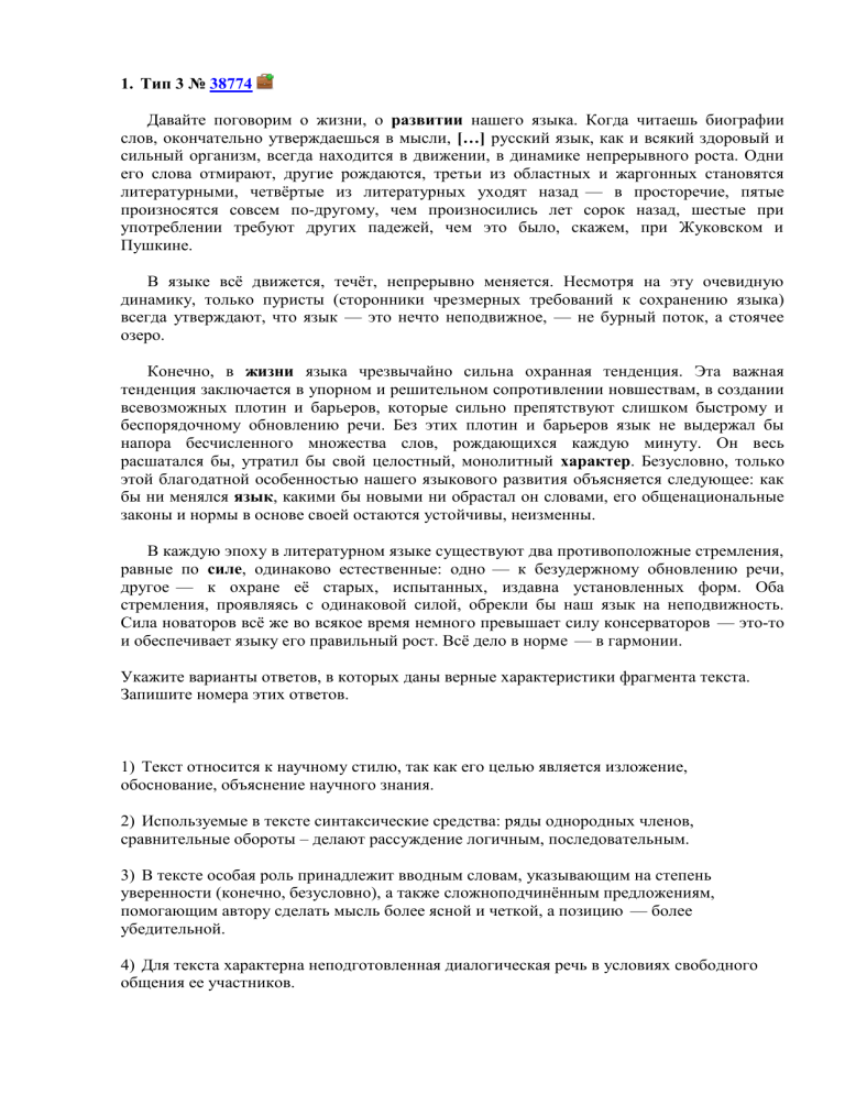 1. Тип 3 № 38774 Давайте поговорим о жизни, о развитии нашего языка. Когда читаешь биографии слов, окончательно утверждаешься в мысли, […] русский язык, как и всякий здоровый и сильный организм, всегда находится в движении, в динамике непрерывного роста. Одни его слова отмирают, другие рождаются, третьи из областных и жаргонных становятся литературными, четвёртые из литературных уходят назад — в просторечие, пятые произносятся совсем по-другому, чем произносились лет сорок назад, шестые при употреблении требуют других падежей, чем это было, скажем, при Жуковском и Пушкине. В языке всё движется, течёт, непрерывно меняется. Несмотря на эту очевидную динамику, только пуристы (сторонники чрезмерных требований к сохранению языка) всегда утверждают, что язык — это нечто неподвижное, — не бурный поток, а стоячее озеро. Конечно, в жизни языка чрезвычайно сильна охранная тенденция. Эта важная тенденция заключается в упорном и решительном сопротивлении новшествам, в создании всевозможных плотин и барьеров, которые сильно препятствуют слишком быстрому и беспорядочному обновлению речи. Без этих плотин и барьеров язык не выдержал бы напора бесчисленного множества слов, рождающихся каждую минуту. Он весь расшатался бы, утратил бы свой целостный, монолитный характер. Безусловно, только этой благодатной особенностью нашего языкового развития объясняется следующее: как бы ни менялся язык, какими бы новыми ни обрастал он словами, его общенациональные законы и нормы в основе своей остаются устойчивы, неизменны. В каждую эпоху в литературном языке существуют два противоположные стремления, равные по силе, одинаково естественные: одно — к безудержному обновлению речи, другое — к охране её старых, испытанных, издавна установленных форм. Оба стремления, проявляясь с одинаковой силой, обрекли бы наш язык на неподвижность. Сила новаторов всё же во всякое время немного превышает силу консерваторов — это-то и обеспечивает языку его правильный рост. Всё дело в норме — в гармонии. Укажите варианты ответов, в которых даны верные характеристики фрагмента текста. Запишите номера этих ответов. 1) Текст относится к научному стилю, так как его целью является изложение, обоснование, объяснение научного знания. 2) Используемые в тексте синтаксические средства: ряды однородных членов, сравнительные обороты – делают рассуждение логичным, последовательным. 3) В тексте особая роль принадлежит вводным словам, указывающим на степень уверенности (конечно, безусловно), а также сложноподчинённым предложениям, помогающим автору сделать мысль более ясной и четкой, а позицию — более убедительной. 4) Для текста характерна неподготовленная диалогическая речь в условиях свободного общения ее участников. 5) Основой приведённого текста является письменная речь, об этом свидетельствует и употребление книжных слов: пуристы, новаторы, консерваторы. 2. Тип 3 № 38777 Начало XX века обозначило собой наступление эры телевидения. […] поэтому нужна была телебашня. Первая башня была построена в 1922 году. В 50-е годы, когда в стране началось бурное развитие телевидения, эта башня уже не справлялась с передачей телесигнала. И в 1967 году была возведена новая телебашня в Останкино. Сегодня с Останкинской телебашни осуществляют вещание 20 радио и 20 телевизионных передатчиков. С башни сигнал при