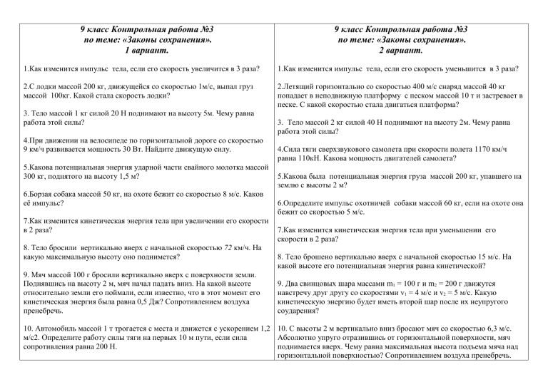 9 класс Контрольная работа №3 по теме: «Законы сохранения». 1 вариант. 9 класс Контрольная работа №3 по теме: «Законы сохранения». 2 вариант. 1.Как изменится импульс тела, если его скорость увеличится в 3 раза? 1.Как изменится импульс тела, если его скорость уменьшится в 3 раза? 2.С лодки массой 200 кг, движущейся со скоростью 1м/с, выпал груз массой 100кг. Какой стала скорость лодки? 2.Летящий горизонтально со скоростью 400 м/с снаряд массой 40 кг попадает в неподвижную платформу с песком массой 10 т и застревает в песке. С какой скоростью стала двигаться платформа? 3. Тело массой 1 кг силой 20 Н поднимают на высоту 5м. Чему равна работа этой силы? 4.При движении на велосипеде по горизонтальной дороге со скоростью 9 км/ч развивается мощность 30 Вт. Найдите движущую силу. 5.Какова потенциальная энергия ударной части свайного молотка массой 300 кг, поднятого на высоту 1,5 м? 6.Борзая собака массой 50 кг, на охоте бежит со скоростью 8 м/с. Каков её импульс? 7.Как изменится кинетическая энергия тела при увеличении его скорости в 2 раза? 8. Тело бросили вертикально вверх с начальной скоростью 72 км/ч. На какую максимальную высоту оно поднимется? 9. Мяч массой 100 г бросили вертикально вверх с поверхности земли. Поднявшись на высоту 2 м, мяч начал падать вниз. На какой высоте относительно земли его поймали, если известно, что в этот момент его кинетическая энергия была равна 0,5 Дж? Сопротивлением воздуха пренебречь. 3. Тело массой 2 кг силой 40 Н поднимают на высоту 2м. Чему равна работа этой силы? 4.Сила тяги сверхзвукового самолета при скорости полета 1170 км/ч равна 110кН. Какова мощность двигателей самолета? 5.Какова была потенциальная энергия груза массой 200 кг, упавшего на землю с высоты 2 м? 6.Определите импульс охотничей собаки массой 60 кг, если на охоте она бежит со скоростью 5 м/с. 7.Как изменится кинетическая энергия тела при уменьшении его скорости в 2 раза? 8. Тело брошено вертикально вверх с начальной скоростью 15 м/с. На какой высоте его потенциальная энергия равна кинетической? 9. Два свинцовых шара массами m1 = 100 г и m2 = 200 г движутся навстречу друг другу со скоростями v1 = 4 м/с и v2 = 5 м/с. Какую кинетическую энергию будет иметь второй шар после их неупругого соударения? 10. Автомобиль массой 1 т трогается с места и движется с ускорением 1,2 10. С высоты 2 м вертикально вниз бросают мяч со скоростью 6,3 м/с. м/с2. Определите работу силы тяги на первых 10 м пути, если сила Абсолютно упруго отразившись от горизонтальной поверхности, мяч сопротивления равна 200 H. поднимается вверх. Чему равна максимальная высота подъема мяча над горизонтальной поверхностью? Сопротивлением воздуха пренебречь. 9 класс Контрольная работа №3 по теме: «Законы сохранения». 3 вариант. 1.Как изменится импульс тела, если его массу увеличится в 3 раза? 9 класс Контрольная работа №3 по теме: «Законы сохранения». 4вариант. 1.Как изменится импульс тела, если его массу уменьшится в 3 раза? 2. Летящая горизонтально со скоростью 100 м/с пуля массой 50 гр. 2. В вагонетку массой 200 кг, движущейся со скоростью 3 м/с, сверху попадает в неподвижный шарик с песком массой 1,450 кг и застревает в опустили груз массой 100кг. Какой стала скорость вагонетки? песке. С какой скоростью покатился шарик? 3. Тело массой 7 кг силой 20 Н поднимают на высоту 10 м. Чему равна 3. Тело массой 3 кг силой 50 Н поднимают на высоту 2 м. Чему равна работа этой силы? работа этой силы? 4.Сила тя