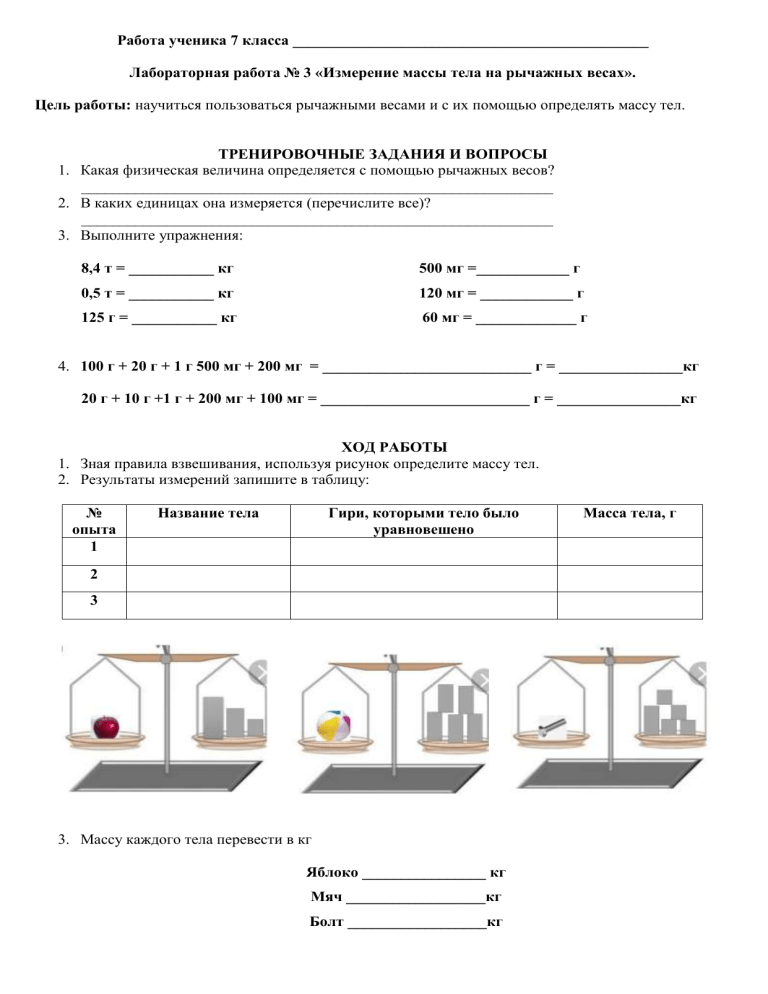 Работа ученика 7 класса ______________________________________________ Лабораторная работа № 3 «Измерение массы тела на рычажных весах». Цель работы: научиться пользоваться рычажными весами и с их помощью определять массу тел. ТРЕНИРОВОЧНЫЕ ЗАДАНИЯ И ВОПРОСЫ 1. Какая физическая величина определяется с помощью рычажных весов? _____________________________________________________________ 2. В каких единицах она измеряется (перечислите все)? _____________________________________________________________ 3. Выполните упражнения: 8,4 т = ___________ кг 500 мг =____________ г 0,5 т = ___________ кг 120 мг = ____________ г 125 г = ___________ кг 60 мг = _____________ г 4. 100 г + 20 г + 1 г 500 мг + 200 мг = ___________________________ г = ________________кг 20 г + 10 г +1 г + 200 мг + 100 мг = ___________________________ г = ________________кг ХОД РАБОТЫ 1. Зная правила взвешивания, используя рисунок определите массу тел. 2. Результаты измерений запишите в таблицу: № опыта 1 Название тела Гири, которыми тело было уравновешено 2 3 3. Массу каждого тела перевести в кг Яблоко ________________ кг Мяч __________________кг Болт __________________кг Масса тела, г Вывод: Сегодня на лабораторной работе я научился ________________________________________________________________________ ________________________________________________________________________ Мне это пригодится ________________________________________________________________________ ________________________________________________________________________ Контрольные вопросы: Какие гирьки нужно выбрать чтобы свесить товары которые показаны на рисунке? 2,5 кг _____________________________ 1,3 кг _____________________________ 1,9 кг _____________________________ 1,2 кг _____________________________ 0,8 кг _____________________________ Работа ученика 7 класса ______________________________________________ Лабораторная работа № 3 «Измерение массы тела на рычажных весах». Цель работы: научиться пользоваться рычажными весами и с их помощью определять массу тел. ТРЕНИРОВОЧНЫЕ ЗАДАНИЯ И ВОПРОСЫ 5. Какая физическая величина определяется с помощью рычажных весов? _____________________________________________________________ 6. В каких единицах она измеряется (перечислите все)? _____________________________________________________________ 7. Выполните упражнения: 8,4 т = ___________ кг 500 мг =____________ г 0,5 т = ___________ кг 120 мг = ____________ г 125 г = ___________ кг 60 мг = _____________ г 8. 100 г + 20 г + 1 г 500 мг + 200 мг = ___________________________ г = ________________кг 20 г + 10 г +1 г + 200 мг + 100 мг = ___________________________ г = ________________кг ХОД РАБОТЫ 4. Зная правила взвешивания, используя рисунок определите массу тел. 5. Результаты измерений запишите в таблицу: № опыта 1 Название тела Гири, которыми тело было уравновешено 2 3 6. Массу каждого тела перевести в кг Яблоко ________________ кг Мяч __________________кг Болт __________________кг Масса тела, г Вывод: Сегодня на лабораторной работе я научился ________________________________________________________________________ ________________________________________________________________________ Мне это пригодится ________________________________________________________________________ ________________________________________________________________________ Контрольные вопросы: Какие гирьки нужно выбрать чтобы свесить товары которые показаны на рисунке? 2,5 кг _____________________________ 1,3 кг _____________________________ 1,9 кг _____________________________ 1,2 кг _____________________________ 0,8 кг _____________________________