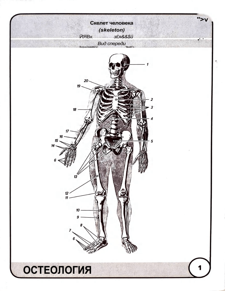 1. Cranium • Череп; 2. Sternum • Грудина; 3. Costae • Ребра; 4. Columna vertebralis • По­