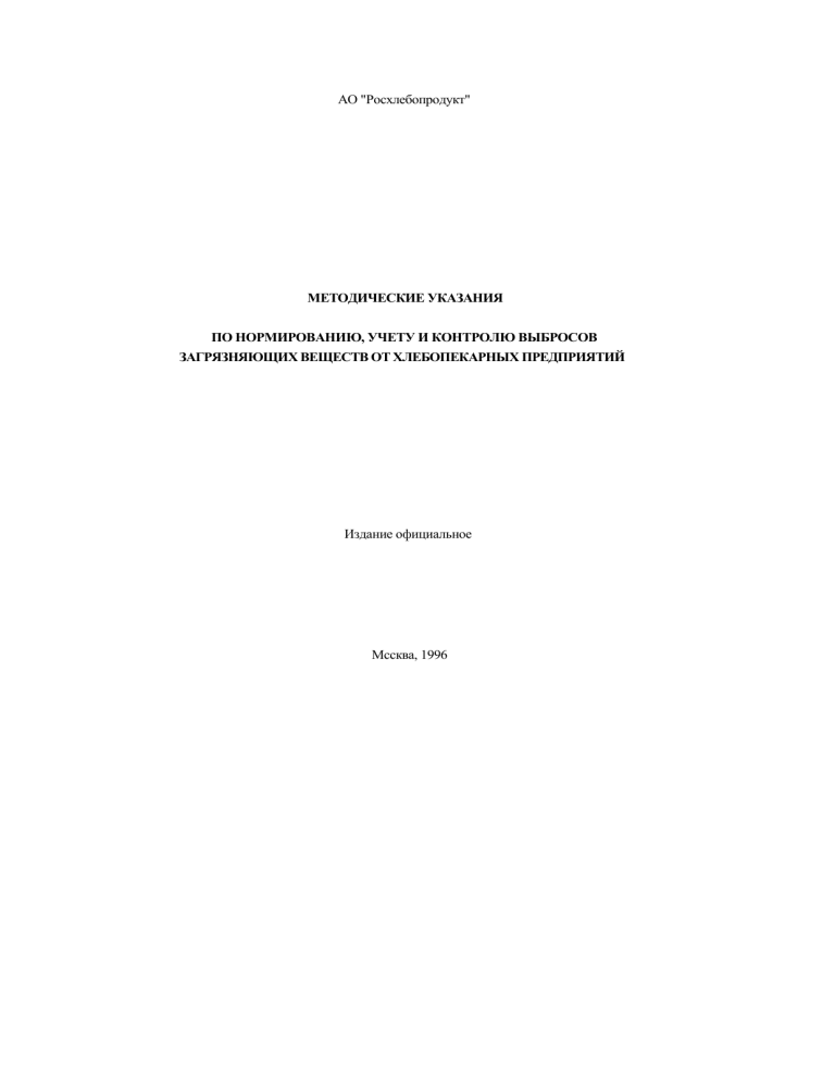АО "Росхлебопродукт" МЕТОДИЧЕСКИЕ УКАЗАНИЯ ПО НОРМИРОВАНИЮ, УЧЕТУ И КОНТРОЛЮ ВЫБРОСОВ ЗАГРЯЗНЯЮЩИХ ВЕЩЕСТВ ОТ ХЛЕБОПЕКАРНЫХ ПРЕДПРИЯТИЙ Издание официальное Мссква, 1996 СВЕДЕНИЯ О ДОКУМЕНТЕ РАЗРАБОТАН Государственным научно-исследовательским институтом хлебопекарной промышленности СОГЛАСОВАН Минприроды России письмом от 09.09.96 № 02-12/35-3560 УТВЕРЖДЕН АО "Росхлебопродукт" 4 октября 1996 г. ВВЕДЕН В ДЕЙСТВИЕ с 1 января 1997 г. СОДЕРЖАНИЕ 1. Общие положения 2. Источники выбросов загрязняющих веществ на хлебопекарных предприятиях 3. Определение выбросов 4. Объемы работ по нормированию, учету и контролю выбросов загрязняющих веществ Приложения: 1. Методология установления удельных выбросов загрязняющих веществ в атмосферу от предприятий хлебопекарной промышленности (информационное). 2. Пример расчета выбросов хлебопекарного предприятия. 3. Пример расчета категории опасности предприятия. 1. ОБЩИЕ ПОЛОЖЕНИЯ Настоящий документ разработан в соответствии с действующим законодательством по охране атмосферного воздуха и конкретизирует его нормы применительно к предприятиям хлебопекарной промышленности с целью унификации работ по нормированию, учету и контролю выбросов на этих предприятиях. 1.1 Ссылки на нормативные документы 1. Закон Российской Федерации "Об охране окружающей природной сре ды". 2. Закон РСФСР "Об охране атмосферного воздуха". 3. Постановление Совета Министров СССР от 16 декабря 1981 г. № 1180 "О нормативах предельно допустимых выбросов загрязняющих веществ в атмосферу и вредных физических воздействий на нее". 4. Постановление Правительства Российской Федерации от 03.08.92 № 545 "Об утверждении "Порядка разработки и утверждения экологических нормативов выбросов и сбросов загрязняющих веществ в окружающую природную среду, лимитов использования природных ресурсов, разме щения отходов". 5. Инструкция по нормированию выбросов (сбросов) загрязняющих ве ществ в атмосферу и в водные объекты (утверждена Госкомприродой СССР 11.09.89). 6. Инструкция Госкомстата СССР от 07.08.90 № 17-24/9-42 "О порядке со ставления отчета об охране атмосферного воздуха по форме № 2 -тп (воздух)". 7. Общесоюзный нормативный документ "Руководство по контролю источ ников загрязнения атмосферы. ОНД-90" (утвержден постановлением Гос комприроды СССР от 30.10.90 № 8). 8. Типовая инструкция по организации системы контроля промышленных выбросов в атмосферу в отраслях промышленности (утверждена Госкомгидрометом СССР 10.06.86). 9. Рекомендации по делению предприятий на категории опасности в зави симости от массы и видового состава выбрасываемых в атмосферу за грязняющих веществ" (ЗапСибНИИ Госкомгидромета СССР, 1987 г.). 1.2 Понятия и определения Основные понятия и определения в этом документе соответствуют ГОСТ 17.2.1.03-84 "Охрана природы. Атмосфера. Термины и определения контроля загрязнения" и ГОСТ 17.2.1.04-77 "Охрана природы. Атмосфера. Метеорологические аспекты загрязнения и промышленные выбросы. Основные термины и определения". Содержащиеся в настоящем документе другие понятия означают: удельный выброс загрязняющего вещества - выброс загрязняющего вещества в атмосферный воздух при производстве 1 тонны продукции в соответствии с технологическим регламентом; бестарный способ приема и хранения муки (БПХМ) - процедура пневматической перекачки муки из автомуковоза в бункеры для ее хранения, обесп