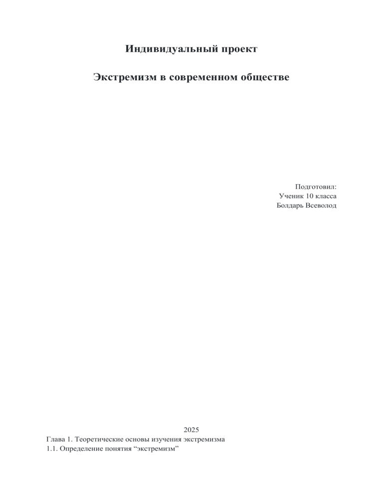 Индивидуальный проект Экстремизм в современном обществе Подготовил: Ученик 10 класса Болдарь Всеволод 2025 Глава 1. Теоретические основы изучения экстремизма 1.1. Определение понятия “экстремизм” В современном мире, характеризующемся динамичными социальными, политическими и экономическими изменениями, проблема экстремизма приобретает особую актуальность. Экстремизм, как сложное и многогранное явление, представляет собой серьезную угрозу для стабильности и безопасности общества, подрывая его ценности и институты. Однако, несмотря на широкое распространение этого термина в политическом дискурсе, средствах массовой информации и научных исследованиях, до сих пор не существует единого общепринятого определения экстремизма. Различные государства, международные организации, ученые и общественные деятели предлагают свои трактовки, отражающие особенности их политических и идеологических позиций, а также специфику национальных законодательств. Сложность определения экстремизма обусловлена несколькими факторами: 1. Политическая и идеологическая обусловленность: Оценка тех или иных действий как экстремистских часто зависит от политической конъюнктуры и идеологических предпочтений. То, что одни считают “борьбой за справедливость”, другие могут квалифицировать как “экстремизм”. 2. Динамичность и изменчивость явления: Экстремизм постоянно эволюционирует, принимая новые формы и используя новые методы. Это затрудняет разработку универсального определения, которое могло бы охватить все возможные проявления экстремизма. 3. Сложность разграничения экстремизма от других форм социальной активности: Важно отличать экстремизм от радикализма, политической оппозиции, гражданского протеста и других форм выражения несогласия с существующим порядком. Тем не менее, анализ различных подходов к определению экстремизма позволяет выделить ряд ключевых признаков, которые характеризуют это явление и отличают его от других форм социальной активности: ● Радикальность: Приверженность крайним взглядам и действиям, отрицание умеренности и компромисса. Экстремисты стремятся к коренным изменениям в обществе, используя для этого радикальные методы. ● Нетерпимость: Неприятие и неприязнь к другим мнениям, культурам, религиям и социальным группам. Экстремисты считают свою точку зрения единственно верной и отвергают любые другие. ● Отрицание демократических ценностей: Отвержение принципов демократии, прав человека, свободы слова, равенства и толерантности. Экстремисты стремятся к установлению авторитарного или тоталитарного режима. ● Насилие или оправдание насилия: Использование насилия или его оправдание для достижения политических или идеологических целей. Экстремисты считают насилие легитимным средством борьбы за свои убеждения. Рассмотрим несколько определений экстремизма, предлагаемых различными источниками: ● Федеральный закон Российской Федерации от 25 июля 2002 г. N 114-ФЗ “О противодействии экстремистской деятельности”: “Экстремистская деятельность (экстремизм) - это насильственное изменение основ конституционного строя и нарушение целостности Российской Федерации; публичное оправдание терроризма и иная террористическая деятельность; возбуждение социальной, расовой, национальной или религиозной розни; проп