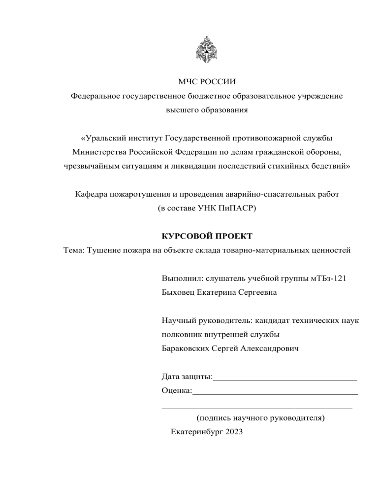 МЧС РОССИИ Федеральное государственное бюджетное образовательное учреждение высшего образования «Уральский институт Государственной противопожарной службы Министерства Российской Федерации по делам гражданской обороны, чрезвычайным ситуациям и ликвидации последствий стихийных бедствий» Кафедра пожаротушения и проведения аварийно-спасательных работ (в составе УНК ПиПАСР) КУРСОВОЙ ПРОЕКТ Тема: Тушение пожара на объекте склада товарно-материальных ценностей Выполнил: слушатель учебной группы мТБз-121 Быховец Екатерина Сергеевна Научный руководитель: кандидат технических наук полковник внутренней службы Бараковских Сергей Александрович Дата защиты: Оценка: (подпись научного руководителя) Екатеринбург 2023 МЧС РОССИИ Уральский Институт Государственной противопожарной службыКафедра «Пожарной тактики и службы» Задание на курсовую работу Курсанта (слушателя) Быховец Екатерина Сергеевна Курс 3 Группа мТБз-121 Вариант № 157 Разработать замысел и решить пожарно-тактическую задачу по тушению условного пожара на объекте склада товарно-материальных ценностей 1. Исходные данные Оперативно-тактическая характеристика объекта (представлена в деле №) 2 Расписание выезда подразделений на пожары (вариант №) 5 Схема пожарного водоснабжения (вариант №) 1 Время возникновения пожара (указать час и мин) 03 час. 30 мин. Время сообщения в ПЧ (указать час и мин) 03 час. 38 мин. Время года (зима, лето) Зима Высота снежного покрова 10 см. Температура наружного воздуха -8 оС, Время суток (СВС – светлое время суток, НБО – ночное время без освещения, НЛ – ночное) НЛ . Возраст пожарных Более 50 . Укомплектованность пожарных подразделений личным составом, К% 90 . Место возникновения пожара (указывается номер места возникновения пожара или пересечение осей на плане объекта) Д-6 . Вид покрытия (А - асфальтовое, Г – грунтовое, У – утрамбованный снег) У . . Категория ДСПТ гарнизона 2 Другие данные, необходимые для выполнения курсового проекта 2 Оглавление ОГЛАВЛЕНИЕ ............................................................................................................. 3 1. ВВЕДЕНИЕ ............................................................................................................ 5 2. ОСНОВНАЯ ЧАСТЬ 2.1. Оперативно-тактическая характеристика объекта............................................ 7 2.2. Тактический замысел ........................................................................................... 8 2.3. Расчёт параметров пожара на момент сообщения о пожаре… ....................... 9 2.4. Расчёт параметров пожара на момент прибытия на пожар первого подразделения ............................................................................................................ 10 2.5. Оценка пожарных подразделений по определению времени развертывания сил и средств подразделениями пожарной охраны ......................11 2.6. Расчёт параметров пожара на момент введения сил и средств первым подразделением ......................................................................................................... 15 2.7. Карточка действий пожарных подразделений ................................................ 17 2.8. Расчет сил и средств для тушения пожара ...................................................... 22 2.9. Расчет параметров пожара по установленному расчетом сил и средств повышенному рангу пожара и до локализации...................................................... 26 2.10. Расчёт оптимальности работы насосно-рукавных систем пожарной техники, работающей по подаче огнетушащих веществ ...................................... 30 2.11. Организация тушения возможного пожара РТП .......................................... 34 2.12. Схема организации связи и 