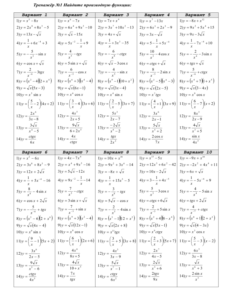 Тренажёр №1 Найдите производную функции: Вариант 1 Вариант 2 Вариант 3 1) у х 8 х 1) у х 7 х 1) у 7 x х 2) у 2 х 8 8 х 3 5 2) у 6 х 4 9 х 3 10 3) у 13 х х Вариант 4 Вариант 5 1) у х 13 х 1) у 8 х x 12 2) у 3 х 7 10 х 2 13 2) у 6 х 3 2 х 5 9 2) у 9 х 2 5 х 4 15 3) у х 15 х 3) у 4 х х 3) у 3 х х 3) у 9 х 3 х 1 6 х 4 3 х 5 5) у 3 sin x х 1 4) у 5 х 2 9 х 4 5) у 5 tgx х 1 3 х 3 35 х 6 5) у 8 ctgx х 4) у 5 1 5х 4 х 10 4 cos x 6) y cos x x 6) y 5 sin x x 6) y x 3 cos x 6 5 4) у 2 7) y 6 x 8) y x 3 4 2 x 4 6 7) y 3tgx x 8) y x 6 3 x 4 4 7 4) у cos x 3 4 4 7) y x 5 5) у 6) y tgx x 6) y ctgx x sin x 8) y x 9 1 10 x 2 х3 1 7 х 4 10 х 2 5) у 4 3 sin x х 4) у 8 7) y 3 x 8) y x 2 5 x 4 3 5 7) y 2 sin x ctgx x 6 8) y x 4 7 1 x 5 9) y x 5 x 3 9) y x 6 x 1 9) y x 3 x 4 9) y x 2 x 5 9) y x 3 4 x 10) y x sin x 10) y x cos x 10) y x sin x 10) y x tgx 10) y x 8 cos x 6 5 4 7 3 2 5 11) y 2 4 x 2 11) y 4 3 x 6 11) y 5 3 x 7 x x x 5 6 4x 5x 3 2x 12) y 12) y 12) y 2x 5 2x 7 3x 8 3 x 13) y 9 x 13) y 6 2x 4x 14) y ctgx x 5 ctgx 14) y 6x 4 Вариант 6 2 x 13) y 5 x 2 tgx 14) y Вариант 7 6 4 11) y 13 x 9 11) y 7 x 2 x x 3x 6 12) y 2x 1 12) y 8x 3 2x 9 5 x 13) y 4 x 13) y x 2 2 cos x 14) y 7x 6 2x 2 Вариант 8 5 14) y Вариант 9 x3 5 sin x 4x 3 Вариант 10 1) у х 6 х 1) у 4 х 7 х 2) у 3 х 8 8 х 3 9 2) у х 4 9 х 5 16 2) у 9 х 2 3 х 4 14 2) у 12 х 3 6 х 2 42 2) у 2 х 2 4 х 4 11 3) у 12 х 2 х 3) у 5 х 12 х 3) у 8 х х 3) у 10 х 2 х 3) у 6 х х 1 5 х 4 16 4) у 9 х 2 1 4 sin x 7 1 4) у 3 4 х 5 х 5 5) у 3 3 cos x х 1 5х 4 9 х 4 5) у 4 5 sin x х 6) y ctgx 6 x 6) y tgx 2 x 2 4) у х 8 5) у х 4 5) у 5 x 6 4) у сtgx х5 7 7) y tgx 8) y x 6 2 x 3 1 14 х 6 3 1) у х 5 х 15 х 3 5 3 х8 7) y 2 x 5 tgx 8) y x 1 12 x 2 7) y 4 sin x 3 1) у 9 х x 10 13 16 6) y 5 x cos x sin x x 8) y x 9 3 x 2 4 х 5) у 6) y 3 sin x x 6) y cos x 2 x 7) y 1) у 10 x х 6 2 3 4) у x 8) y x 2 4 8 x 4 4 ctgx x 7 8) y x 8 1 2 x 2 7) y 5 sin x 9) y x 4 x 4 9) y x 12 x 1 9) y x 2 x 8 9) y x 5 x 1 9) y x 4 3 x 10) y x sin x 10) y x cos x 10) y x tgx 10) y x ctgx 10) y x 3 cos x 9 8 11 9 6 5 2 9 3 11) y 15 x 2 11) y 12 x 6 11) y 5 3 x 8 11) y 3 5 x 7 11) y 3 x 2 x x x x x 6 3 7 4x 6x 2x 3x 6 4x3 12) y 12) y 12) y 12) y 12) y 8x 5 3x 8 4x 5 2x 5 3x 9 13) y 14) y 9 x x 6 ctgx 5 4x3 13) y 4 x 10 x 7x 14) y tgx 5 13) y 14) y 5 x x 1 ctgx 7 6x2 13) y 2 x x 6 2tgx 14) y 9x 3 13) y 14) y x x 3 2 sin x 6 x3 Тренажёр №2 Найдите производную сложной функции: Вариант 1 1) у 5 х 6 1) у 4 х 3 4 2) у 2 7 х 2 3 x 3) у 42 х 9 4) у 5) у Вариант 2 3 3) у 38 х 1 1 4) у 3 х 5 3 5 5) у 6 4 х 5 2) у 8 5 х 2 4 x 4) у 3 8 5 х х 12 4 5) у 6 5 2) у 6 3 х 2 5 x 4) у 5 х 3 2 5 5) у 7 6 х 4 2) у 5 4 х 2 9 x 3) у 83 х 2 1 3 4) у 7 5) у 4 х 6 6 5 3 х 6) у 8 3 х 4 х 11 5 7) у 6 5 1 3 4 1 2 х 4 5 4 3 7 х 5 6) у 6 5 х 3 х 10 2 7) у 9 3) у 56 х 8 6) у 4 2 х 7 х 13 3 7) у 2 4 1) у 6 х 7 1) у 2 х 5 3) у 24 х 3 3 Вариант 5 4 4 6) у 3 4 х 9 6) у 2 6 х 2 7) у 1 7 х 2 Вариант 4 3 2) у 7 6 х 2 2 x 2 1) у 3 х 4 5 Вариант 3 х 14 9 7) у 8) у sin 6 x 3 9) y 4 cos2 x 8) у sin 7 x 4 9) y 2 cos3 x 8) у sin 5 x 6 9) y 3 cos4 x 2 8) у sin 4 x 5 9) y 9 cos5 x 8) у sin 8 x 2 9) y 6 cos7 x 10) y tg 3 x 4 x 11) y 4ctg 2 6 10) y tg 5 x 3 x 11) y 6ctg 3 2 10) y tg 4 x 5 x 11) y 3ctg 6 3 10) y tg 2 x 6 x 11) y 5ctg 4 2 10) y tg 4 x 3 x 11) y 2ctg 5 4 12) y 5 sin 3 3 x 2 12) y 4 sin 2 2 x 6 12) y 8 sin 4 4 x 2 12) y 7 sin 3 5 x 4 12) y 6 sin 3 8 x 5 Вариант 6 Вариант 7 Вариант 8 Вариант 9 Вариант 10 1) у 2 х 13 5 2) у 11 5 х 2 4 x 3) у 113 х 9 4) у 5) у 2 4 1 4 х 6 5 6 6) у 8 15 х 3 7) у х 16 8 1) у 4 х 3 6 2) у 17 5 х 2 6 x 3) у 162 х 7 4) у 3 10 5 х 1) у 14 х 2 5) у 4 3 1 9 х 1 4 3 3 4 х 6 6) у 2 7 х 11 7) у х 3 2 1) у 5 х 2 3 2) у 5 9 х 2 8 x 3) у 43 х 5 4) у 5) у 5 2 1 6 х 2 17 10 2 х 4 6) у 11 3 х 9 7) у 3) у 65 х 4 х 1 4 5) у 6 5 1 3 х 7 3 16 3 5 х 7 6) у 3 4 х 8 7) у 1) у 7 х 1 8 2) у 3 6 х 2 4 x 4) у 2 4 х 9 3 2) у 1 3 х 2 4 x 3) у 7 5 х 4 4) у 5) у 5 6 1 6 х 2 5 14 4 5 х 5 6) у 3 4 х 6 7) у х 9 6 8) у sin 9 x 3 9) y 7 cos5 x 8) у sin 6 x 4 9) y 6 cos2 x 8) у sin 8 x 2 9) y 4 cos4 x 2 8) у sin 7 x 6 9) y 8 cos5 x 8) у sin 5 x 3 9) y 2 cos3 x 10) y tg 4 x 4 x 11) y 3ctg 3 6 10) y tg 9 x 3 x 11) y 7 ctg 5 2 10) y tg 8 x 9 x 11) y 2ctg 7 3 10) y tg 5 x 6 x 11) y 3ctg 6 2 10) y tg 2 x 6 x 11) y 4ctg 2 4 12) y 6 sin 3 4 x 5 12) y 3 sin 2 4 x 6 12) y 4 sin 4 5 x 6 12) y 2 sin 3 3 x 4 12) y 7 sin 3 2 x 7