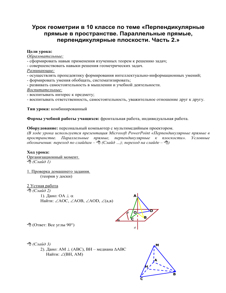Урок геометрии в 10 классе по теме «Перпендикулярные прямые в пространстве. Параллельные прямые, перпендикулярные плоскости. Часть 2.» Цели урока: Образовательные: - сформировать навык применения изученных теорем к решению задач; - совершенствовать навыки решения геометрических задач. Развивающие: - осуществлять пропедевтику формирования интеллектуально-информационных умений; - формировать умения обобщать, систематизировать; - развивать самостоятельность в мышлении и учебной деятельности. Воспитательные: - воспитывать интерес к предмету; - воспитывать ответственность, самостоятельность, уважительное отношение друг к другу. Тип урока: комбинированный Формы учебной работы учащихся: фронтальная работа, индивидуальная работа. Оборудование: персональный компьютер с мультимедийным проектором. (В ходе урока используется презентация Microsoft PowerPoint «Перпендикулярные прямые в пространстве. Параллельные прямые, перпендикулярные к плоскости». Условные обозначения: переход по слайдам – (Слайд …); переход на слайде – ) Ход урока: Организационный момент. (Слайд 1) 1. Проверка домашнего задания. (теория у доски) 2 Устная работа (Слайд 2) 1). Дано: OA Найти: AOC, AOB, AOD, (a,в) A в (Ответ: Все углы 90°) D O B C a (Слайд 3) 2). Дано: AM (ABC), BH – медиана ABC Найти: (BH, AM) М A H B C (Ответ: 90°) (Слайд 4) 3). Дано: BF (ABC), ABCD – квадрат Найти: (BF, AC), (BF, AD), (BF, DC) F B (Ответ: Все углы 90°) A (Слайд 5) 4). Дано: AB , CD , AB = CD Найти: Определите вид четырехугольника ABCD C D B C A (Ответ: параллелограмм) D (Слайд 6) 5). Дано: ABCD – параллелограмм, AB , АC = 10 Найти: BD B A (Ответ: 10) (Слайд 7) 6). Дано: ABCD – параллелограмм, BD , AB = 7 Найти: PABCD C D A D (Ответ: 28) (Слайд 8) 7). Дано: Верно ли утверждение: «Прямая называется перпендикулярной плоскости, если она перпендикулярна какой-нибудь прямой, лежащей в этой плоскости». Ответ обоснуйте. (Ответ: утверждение не верно.) 3. Решение задач. (Слайд 9) 1). Дано: ABC – правильный, CD (ABC), OK CD, AB = 16√3 см, OK = 12 см, CD = 16 см, O – центр ABC Найти: BD, AD, AK, BK. B C в a K D A C N O M B (Решение: BD = AD, т.к. BCD =ACD (как прямоугольные по двум катетам). AD = √ (162+(16√3)2) = √ (162– 4) = 16 · 2 = 32 см. АК = ВС, т.к. АОК =ВОК (как прямоугольные по двум катетам). АО = а √3 : 3, АО = (16√3 ·√3) : 3 = 16 см. АК = √(122+162) = 20 см.) (Ответ: BD = AD = 32 см, AK = BK = 20 см.) (Слайд 10) 2). Дано: PP1 , QQ1 , PQ = 15 см, PP1= 21,5 см, QQ1= 33,5 см Найти: P1Q1. (Решение: (PP1 , QQ1 ) PP1 QQ1. PP1, QQ1=β, β =Р1 Q1. QК = 33,5 – 21,5 = 12 см. Р Q1= РК = 9 см. (Ответ: 9 см.) Q P P1 K Q1 4. Подведение итогов урока. 5. Домашнее задание. п.15-16, №126, № 119 (б, в). Используемая литература: 1. Геометрия: Учебник для средней школы. 10–11 классы./ Под ред. Л.С. Атанасяна, В.Ф. Бутузова, С.Б. Кадомцева и др. – М.: Просвещение, 1992. 2. Геометрия. 10 класс. Поурочные планы / Авт.-сост. Г.И. Ковалева – Волгоград: Учитель, 2004