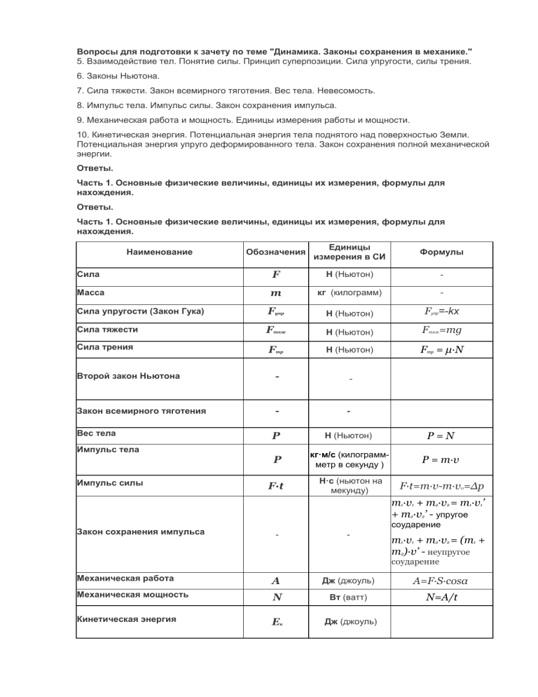 Вопросы для подготовки к зачету по теме "Динамика. Законы сохранения в механике." 5. Взаимодействие тел. Понятие силы. Принцип суперпозиции. Сила упругости, силы трения. 6. Законы Ньютона. 7. Сила тяжести. Закон всемирного тяготения. Вес тела. Невесомость. 8. Импульс тела. Импульс силы. Закон сохранения импульса. 9. Механическая работа и мощность. Единицы измерения работы и мощности. 10. Кинетическая энергия. Потенциальная энергия тела поднятого над поверхностью Земли. Потенциальная энергия упруго деформированного тела. Закон сохранения полной механической энергии. Ответы. Часть 1. Основные физические величины, единицы их измерения, формулы для нахождения. Ответы. Часть 1. Основные физические величины, единицы их измерения, формулы для нахождения. Обозначения Единицы измерения в СИ Формулы Сила F Н (Ньютон) - Масса m кг (килограмм) - Сила упругости (Закон Гука) Fупр Н (Ньютон) Fупр=-kx Сила тяжести Fтяж Н (Ньютон) Fтяж=mg Сила трения Fтр Н (Ньютон) Fтр = μ·N Второй закон Ньютона - - Закон всемирного тяготения - - Вес тела P Н (Ньютон) P=N P кг·м/с (килограммметр в секунду ) P = m·v F·t Н·с (ньютон на мекунду) F·t=m·v-m·v0=Δp Наименование Импульс тела Импульс силы m1·v1 + m2·v2 = m1·v1’ + m2·v2’ - упругое Закон сохранения импульса соударение - - m1·v1 + m2·v2 = (m1 + m2)·v’ - неупругое соударение Механическая работа A Дж (джоуль) A=F·S·cosα Механическая мощность N Вт (ватт) N=A/t Кинетическая энергия Eк Дж (джоуль) Потенциальная энергия тела, поднятого над поверхностью Земли Eп , Ep Дж (джоуль) Ep=m·g·h Потенциальная энергия упруго деформированного тела Eп, Ep Дж (джоуль) Ep=k·x2/2 - - Ek1 + Ep1 = Ek2 + Ep2 Закон сохранения полной механической энергии 1. Взаимодействие тел. Понятие силы. Взаимодействие - действие тел друг на друга. Величину, характеризующую взаимодействие тел, называют сила. 2. Понятие силы. Сила — физическая величина, которая определяет меру воздействия одного тела на другое. F - обозначение силы Сила – векторная величина; она характеризуется: модулем (абсолютной величиной); направлением; точкой приложения. Измеряется сила при помощи прибора «динамометр». Единица измерения силы - Ньютон [1Н]. 3. Принцип суперпозиции. Принцип суперпозиции сил: если тело взаимодействует одновременно с несколькими телами, то результирующая сила, действующая на данное тело, равна векторной сумме сил, действующих на это тело со стороны всех других тел. 4. Масса (определение, обозначение, единицы измерения). Масса – это физическая величина, выражающая меру инертности тела. m Единица измерения массы в СИ – килограмм [1 кг ] 5. Сила упругости (определение, формула, единицы измерения). Закон Гука. Сила упругости – сила, которая возникает при любом виде деформации тел и стремится вернуть тело в первоначальное состояние. Закон Гука: Fупр = - k·x, где k – жесткость тела [Н/м] Единица измерения силы - ньютон [1 Н] 6. Сила трения (определение, формула, единицы измерения). Виды сил трения. Сила трения – это сила, возникающая при движении одного тела по поверхности другого, приложенная к движущемуся телу и направлена против движения. Сила трения - это сила электромагнитной природы. Возникновение силы трения объясняется двумя причинами: 1) Шероховатостью поверхностей 2) Проявлением сил молекулярного взаимодействия. Fтр = μ·N, где μ – коэффициент трения , N – сила реакции опоры. Единица измерения силы - ньютон [1 Н] Виды сил трения: Сила трения покоя — сила, во