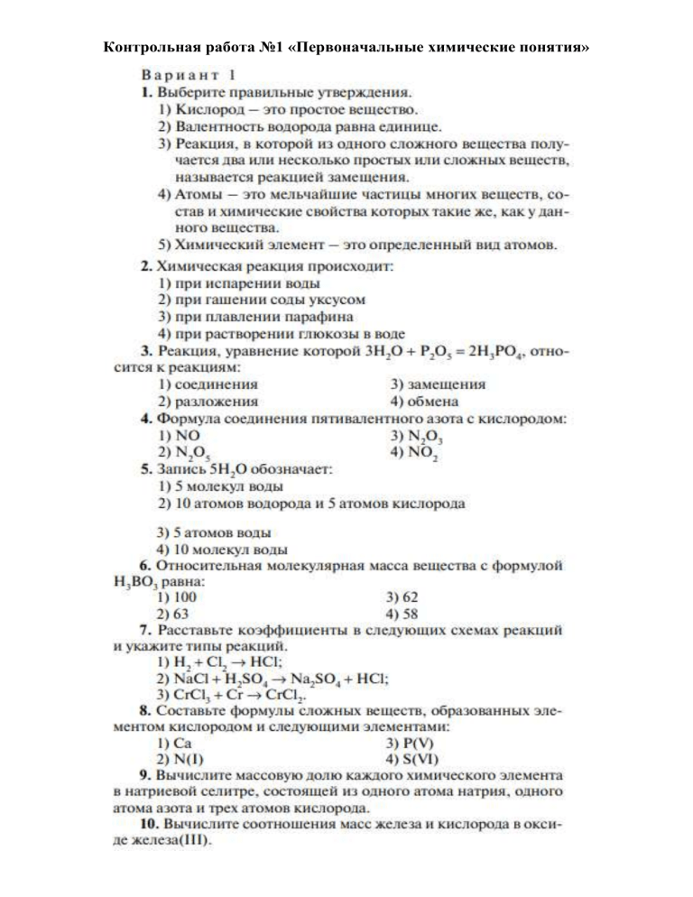 Контрольная работа №1 «Первоначальные химические понятия» Контрольная работа №1 «Первоначальные химические понятия» Контрольная работа №1 «Первоначальные химические понятия» Контрольная работа №1 «Первоначальные химические понятия»
