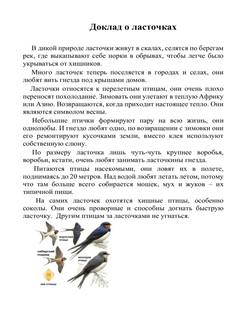 Доклад о ласточках В дикой природе ласточки живут в скалах, селятся по берегам рек, где выкапывают себе норки в обрывах, чтобы легче было укрываться от хищников. Много ласточек теперь поселяется в городах и селах, они любят вить гнезда под крышами домов. Ласточки относятся к перелетным птицам, они очень плохо переносят похолодание. Зимовать они улетают в теплую Африку или Азию. Возвращаются, когда приходит настоящее тепло. Они являются символом весны. Небольшие птички формируют пару на всю жизнь, они однолюбы. И гнездо любят одно, по возвращении с зимовки они его ремонтируют кусочками земли, вместо клея используют собственную слюну. По размеру ласточка лишь чуть-чуть крупнее воробья, воробьи, кстати, очень любят занимать ласточкины гнезда. Питаются птицы насекомыми, они ловят их в полете, поднимаясь до 20 метров. Над водой любят летать летом, потому что там больше всего собирается мошек, мух и жуков – их типичной пищи. На самих ласточек охотятся хищные птицы, особенно соколы. Они очень проворные и способны догнать быструю ласточку. Другим птицам за ласточками не угнаться.