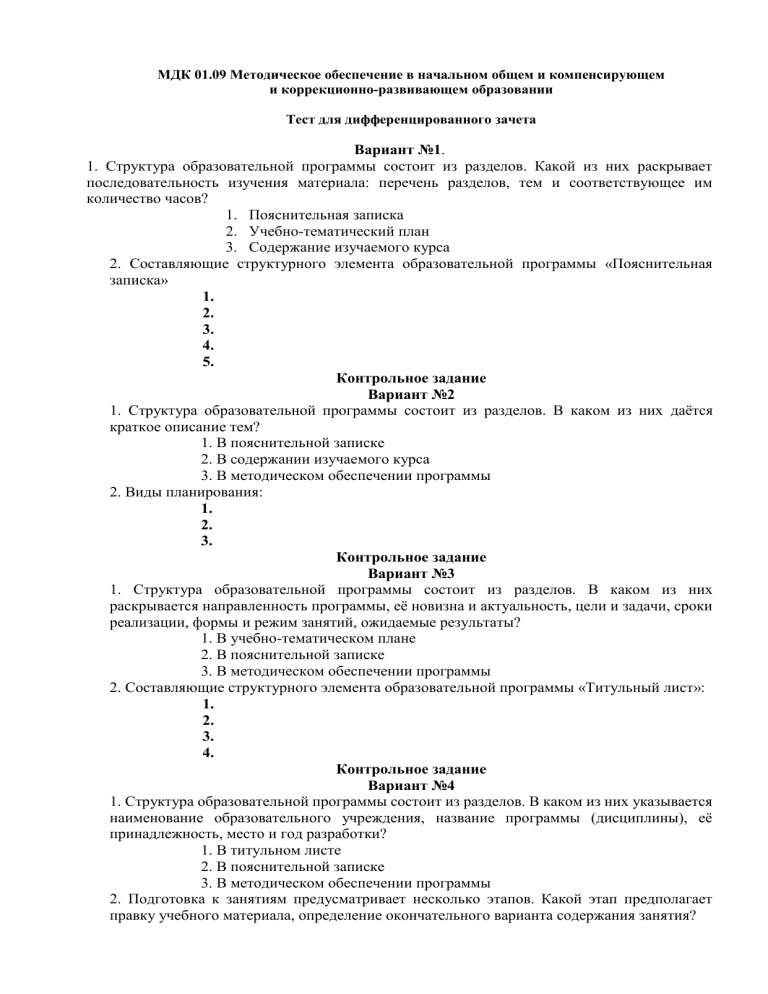 МДК 01.09 Методическое обеспечение в начальном общем и компенсирующем и коррекционно-развивающем образовании Тест для дифференцированного зачета Вариант №1. 1. Структура образовательной программы состоит из разделов. Какой из них раскрывает последовательность изучения материала: перечень разделов, тем и соответствующее им количество часов? 1. Пояснительная записка 2. Учебно-тематический план 3. Содержание изучаемого курса 2. Составляющие структурного элемента образовательной программы «Пояснительная записка» 1. 2. 3. 4. 5. Контрольное задание Вариант №2 1. Структура образовательной программы состоит из разделов. В каком из них даётся краткое описание тем? 1. В пояснительной записке 2. В содержании изучаемого курса 3. В методическом обеспечении программы 2. Виды планирования: 1. 2. 3. Контрольное задание Вариант №3 1. Структура образовательной программы состоит из разделов. В каком из них раскрывается направленность программы, её новизна и актуальность, цели и задачи, сроки реализации, формы и режим занятий, ожидаемые результаты? 1. В учебно-тематическом плане 2. В пояснительной записке 3. В методическом обеспечении программы 2. Составляющие структурного элемента образовательной программы «Титульный лист»: 1. 2. 3. 4. Контрольное задание Вариант №4 1. Структура образовательной программы состоит из разделов. В каком из них указывается наименование образовательного учреждения, название программы (дисциплины), её принадлежность, место и год разработки? 1. В титульном листе 2. В пояснительной записке 3. В методическом обеспечении программы 2. Подготовка к занятиям предусматривает несколько этапов. Какой этап предполагает правку учебного материала, определение окончательного варианта содержания занятия? 1. Планирование 2. Оперативная подготовка 3. Редактирование Контрольное задание Вариант №5 1. Структура образовательной программы состоит из разделов. В каком из них указывается основная и дополнительная литература, справочные издания, учебники, учебные пособия? 1. В титульном листе 2. В списке литературы 3. В методическом обеспечении программы 2. Назвать: Структурные элементы образовательной программы: 1. 2. 3. 4. 5. 6. Контрольное задание Вариант №6 1. Структура образовательной программы состоит из разделов. Какой из них включает перечень методической продукции (пособия, разработки, рекомендации), дидактический материал, техническое оснащение занятий, рекомендации по проведению практических занятий и т.п.? 1. Пояснительная записка 2. Содержание изучаемого курса 3. Методическое обеспечение программы 2. Какая образовательная программа отличается собственной концептуальной основой, новыми методическими идеями, новизной не менее чем 70 %? 1. Модифицированная программа 2. Экспериментальная программа 3. Авторская новаторская программа Контрольное задание Вариант №7 1. На основе какого вида плана составляется план занятия? 1. На основе учебного плана 2. На основе перспективного плана 3. На основе календарно-тематического плана 2. Какая образовательная программа используется без изменений в содержании и методике, но с некоторыми поправками в последовательности изложения материала и количестве часов, отводимых на изучение той или иной темы? 1. Модифицированная программа 2. Рабочая программа 3. Традиционная программа Контрольное задание Вариант №8 1. Какой ви