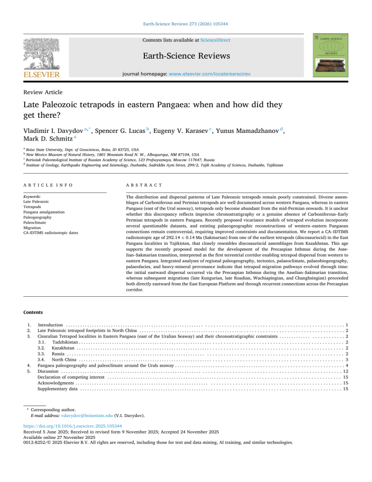 Earth-Science Reviews 273 (2026) 105344 Contents lists available at ScienceDirect Earth-Science Reviews journal homepage: www.elsevier.com/locate/earscirev Review Article Late Paleozoic tetrapods in eastern Pangaea: when and how did they get there? Vladimir I. Davydov a,* , Spencer G. Lucas b, Eugeny V. Karasev c , Yunus Mamadzhanov d, Mark D. Schmitz a a Boise State University, Dept. of Geosciences, Boise, ID 83725, USA New Mexico Museum of Natural History, 1801 Mountain Road N. W., Albuquerque, NM 87104, USA Borissiak Paleontological Institute of Russian Academy of Science, 123 Profsoyuznaya, Moscow 117647, Russia d Institute of Geology, Earthquake Engineering and Seismology, Dushanbe, Sadriddin Ayni Street, 299/2, Tajik Academy of Sciences, Dushanbe, Tajikistan b c A R T I C L E I N F O A B S T R A C T Keywords: Late Paleozoic Tetrapods Pangaea amalgamation Paleogeography Paleoclimate Migration CA-IDTIMS radioisotopic dates The distribution and dispersal patterns of Late Paleozoic tetrapods remain poorly constrained. Diverse assemblages of Carboniferous and Permian tetrapods are well documented across western Pangaea, whereas in eastern Pangaea (east of the Ural seaway), tetrapods only become abundant from the mid-Permian onwards. It is unclear whether this discrepancy reflects imprecise chronostratigraphy or a genuine absence of Carboniferous–Early Permian tetrapods in eastern Pangaea. Recently proposed vicariance models of tetrapod evolution incorporate several questionable datasets, and existing palaeogeographic reconstructions of western–eastern Pangaean connections remain controversial, requiring improved constraints and documentation. We report a CA–IDTIMS radioisotopic age of 292.14 ± 0.14 Ma (Sakmarian) from one of the earliest tetrapods (discosauriscid) in the East Pangaea localities in Tajikistan, that closely resembles discosauriscid assemblages from Kazakhstan. This age supports the recently proposed model for the development of the Precaspian Isthmus during the Asselian–Sakmarian transition, interpreted as the first terrestrial corridor enabling tetrapod dispersal from western to eastern Pangaea. Integrated analyses of regional paleogeography, tectonics, palaeoclimate, palaeobiogeography, palaeofacies, and heavy-mineral provenance indicate that tetrapod migration pathways evolved through time: the initial eastward dispersal occurred via the Precaspian Isthmus during the Asselian–Sakmarian transition, whereas subsequent migrations (late Kungurian, late Roadian, Wuchiapingian, and Changhsingian) proceeded both directly eastward from the East European Platform and through recurrent connections across the Precaspian corridor. Contents 1. 2. 3. 4. 5. Introduction . . . . . . . . . . . . . . . . . . . . . . . . . . . . . . . . . . . . . . . . . . . . . . . . . . . . . . . . . . . . . . . . . . . . . . . . . . . . . . . . . . . . . . . . . . . . . . . . . . . . . . . . . . . . . 1 Late Paleozoic tetrapod footprints in North China . . . . . . . . . . . . . . . . . . . . . . . . . . . . . . . . . . . . . . . . . . . . . . . . . . . . . . . . . . . . . . . . . . . . . . . . . . . . . . . . . 2 Cisuralian Tetrapod localities in Eastern Pangaea (east of the Uralian Seaway) and their chronostratigraphic constraints . . . . . . . . . . . . . . . . . . . . . . . . . 2 3.1. Tadzhikistan . . . . . . . . . . . . . . . . . . . . . . . . . . . . . . . . . . . . . . . . . . . . . . . . . . . . . . . . . . . . . . . . . . . . . . . . . . . . . . . . . . . . . . . . . . . . . . . . . . . . . . . . 2 3.2. Kazakhstan . . . . . . . . . . . . . . . . . . . . . . . . . . . . . . . . . . . . . . . . . . . . . . . . . . . . . . . . . . . . . . . . . . . . . . . . . . . . . . . . . . . . . . . . . . . . . . . . . . . . . . . . . 2 3.3. Russia . . . . . . . . . . . . . . . . . . . . . . . . . . . . . . . . . . . . . . . . . . . . . . . . . . . . . . . . . . . . . . . . . . . . . . . . . . . . . . . . . . . . . . . . . . . . . . . . . . . . . . . . . . . . 2 3.4. North China . . . . . . . . . . . . . . . . . . . . . . . . . . . . . . . . . . . . . . . . . . . . . . . . . . . . . . . . . . . . . . . . . . . . . . . . . . . . . . . . . . . . . . . . . . . . . . . . . . . . . . . . 3 Pangaea paleogeography and paleoclimate around the Urals seaway . . . . . . . . . . . . . . . . . . . . . . . . . . . . . . . . . . . . . . . . . . . . . . . . . . . . . . . . . . . . . . . . . . . 4 Discussion . . . . . . . . . . . . . . . . . . . . . . . . . . . . . . . . . . . . . . . . . . . . . . . . . . . . . . . . . . . . . . . . . . . . . . . . . . . . . . . . . . . . . . . . . . . . . . . . . . . . . . . . . . . . . . 12 Declaration of competing interest . . . . . . . . . . . . . . . . . . . . . . . . . . . . . . . . . . . . . . . . . . . . . . . . . . . . . . . . . . . . . . . . . . . . . . . . . . . . . . . . . . . . . . . . . . . . 15 Acknowledgments . . . . . . . . . . . . . . . . . . . . . . . . . . . . . . . . . . . . . . . . . . . . . . . . . . . . . . . . . . . . . . . . . . . . . . . . . . . . . . . . . . . . . . . . . . . . . . . . . . . . . . . . 15 Supplementary data . . . . . . . . . . . . . . . . . . . . . . . . . . . . . . . . . . . . . . . . . . . . . . . . . . . . . . . . . . . . . . . . . . . . . . . . . . . . . . . . . . . . . . . . . . . . . . . . . . . . . . . 15 * Corresponding author. E-mail address: vdavydov@boisestate.edu (V.I. Davydov). https://doi.org/10.1016/j.earscirev.2025.105344 Received 5 June 2025; Received in revised form 9 November 2025; Accepted 24 November 2025 Available online 27 November 2025 0012-8252/© 2025 Elsevier B.V. All rights are reserved, including those for text and data mining, AI training, and similar technologies. V.I. Davydov et al. Earth-Science Reviews 273 (2026) 105344 Data availability . . . . . . . . . . . . . . . . . . . . . . . . . . . . . . . . . . . . . . . . . . . . . . . . . . . . . . . . . . . . . . . . . . . . . . . . . . . . . . . . . . . . 