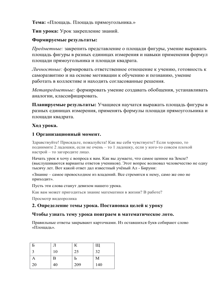 Тема: «Площадь. Площадь прямоугольника.» Тип урока: Урок закрепление знаний. Формируемые результаты: Предметные: закрепить представление о площади фигуры, умение выражать площадь фигуры в разных единицах измерения и навыки применения формул площади прямоугольника и площади квадрата. Личностные: формировать ответственное отношение к учению, готовность к саморазвитию и на основе мотивации к обучению и познанию, умение работать в коллективе и находить согласованные решения. Метапредметные: формировать умение создавать обобщения, устанавливать аналогии, классифицировать. Планируемые результаты: Учащиеся научатся выражать площадь фигуры в разных единицах измерения, применять формулы площади прямоугольника и площади квадрата. Ход урока. 1 Организационный момент. Здравствуйте! Присядьте, пожалуйста! Как вы себя чувствуете? Если хорошо, то поднимите 2 ладошки, если не очень – то 1 ладошку, если у кого-то совсем плохой настрой – то загородите лицо. Начать урок я хочу с вопроса к вам. Как вы думаете, что самое ценное на Земле? (выслушиваются варианты ответов учеников). Этот вопрос волновал человечество не одну тысячу лет. Вот какой ответ дал известный учёный Ал - Бируни: «Знание – самое превосходное из владений. Все стремятся к нему, само же оно не приходит». Пусть эти слова станут девизом нашего урока. Как вам может пригодиться знание математики в жизни? В работе? Просмотр видеоролика 2. Определение темы урока. Постановка целей к уроку Чтобы узнать тему урока поиграем в математическое лото. Правильные ответы закрывают карточками. Из оставшихся букв собирают слово «Площадь». Б Л К Щ 3 10 25 32 А В Ь М 20 40 209 140 Г П Ж Д 99 11 4 180 У Я О Ф 30 18 36 108 Задание к математическому лото. 1. Незнайка прошел по тропинке 12 км со скоростью 4 км/ч. Сколько времени он был в пути? 2. Волк решил проведать собаку в деревне. Скорость волка 20 км/ч. Какое расстояние следует пробежать волку до встречи за 2 часа? 3. Корабль пиратов прошел расстояние 50 км за 2 часа. Найдите скорость пиратского корабля. 4. Пчела летит со скоростью 35 км/ч. Какое расстояние пролетит пчела в поисках нектара за 4 часа? 5. Иван царевич должен отправиться в тридевятое царство, до которого расстояние 2800 км. Скорость ковра-самолета 700 км/ч. Сколько времени ему потребуется на перелет до тридевятого царства? 6. Марья - искусница отрезала косынку и решила ее подшить. Вычислите периметр косынки-треугольника, все стороны которого равны 33 см. 7. Царевна-Несмеяна нашла у матери зеркало. Зеркало имеет форму квадрата. Вычислите периметр квадрата со стороной 27 дм. 8. Малыш вручил Карлсону торт. Вычислите периметр торта в форме прямоугольника, если его стороны равны 5дм и 4 дм. 9. Маша попросила Медведя сделать бассейн. Вычислите периметр прямоугольного бассейна, если его стороны равны 3 м и 12 м. Из оставшихся букв составляют слово «площадь». -Сформулируйте тему урока - Какую цель вы перед собой поставите? (Закрепить правило нахождения площади прямоугольника и использовать его при решении задач) Какие задачи вы поставите перед собой? Закрепить нахождения площадей квадрата и прямоугольника по формулам - В этом слове три орфограммы, назовите их. _Ребята посмотрите на геометрические фигуры - Как вы думаете, какие фигуры лишние и почему? ( круг и треугольник. Т.К. все остальные фигуры, четырёхугольники) - Какие фигуры называются четырёху