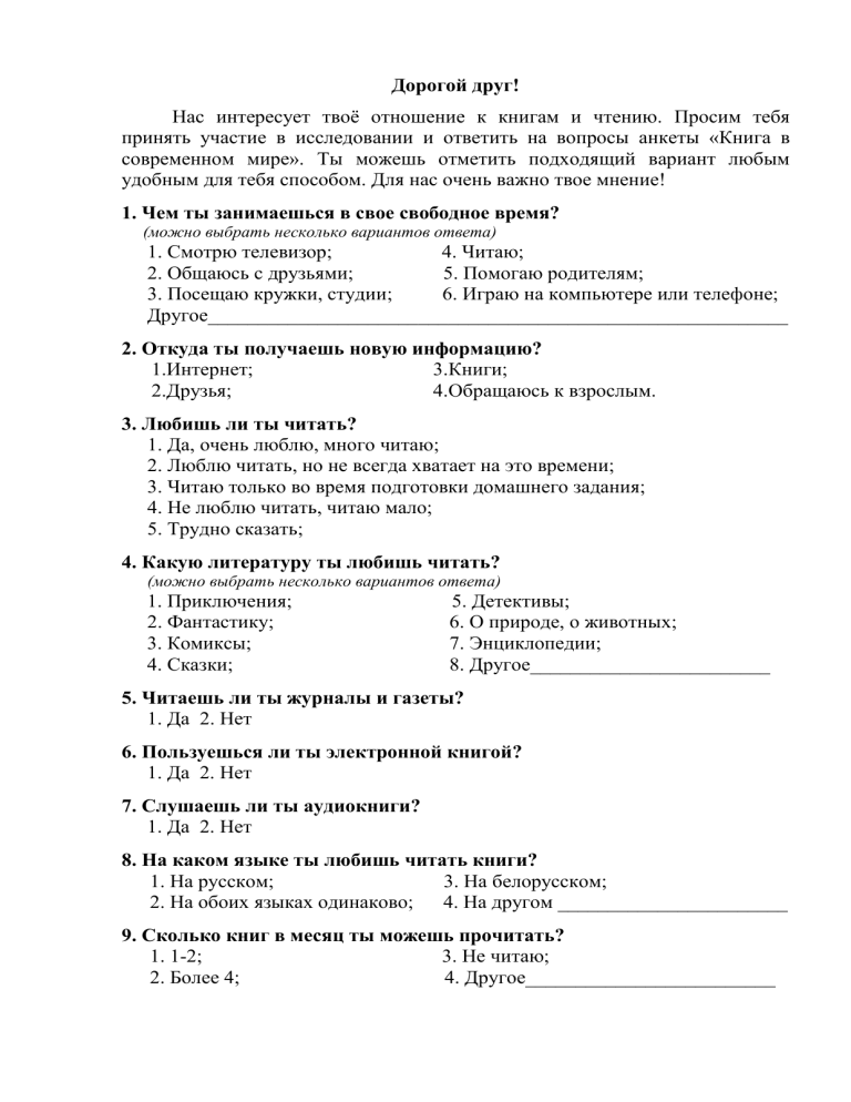 Дорогой друг! Нас интересует твоё отношение к книгам и чтению. Просим тебя принять участие в исследовании и ответить на вопросы анкеты «Книга в современном мире». Ты можешь отметить подходящий вариант любым удобным для тебя способом. Для нас очень важно твое мнение! 1. Чем ты занимаешься в свое свободное время? (можно выбрать несколько вариантов ответа) 1. Смотрю телевизор; 4. Читаю; 2. Общаюсь с друзьями; 5. Помогаю родителям; 3. Посещаю кружки, студии; 6. Играю на компьютере или телефоне; Другое__________________________________________________________ 2. Откуда ты получаешь новую информацию? 1.Интернет; 3.Книги; 2.Друзья; 4.Обращаюсь к взрослым. 3. Любишь ли ты читать? 1. Да, очень люблю, много читаю; 2. Люблю читать, но не всегда хватает на это времени; 3. Читаю только во время подготовки домашнего задания; 4. Не люблю читать, читаю мало; 5. Трудно сказать; 4. Какую литературу ты любишь читать? (можно выбрать несколько вариантов ответа) 1. Приключения; 2. Фантастику; 3. Комиксы; 4. Сказки; 5. Детективы; 6. О природе, о животных; 7. Энциклопедии; 8. Другое________________________ 5. Читаешь ли ты журналы и газеты? 1. Да 2. Нет 6. Пользуешься ли ты электронной книгой? 1. Да 2. Нет 7. Слушаешь ли ты аудиокниги? 1. Да 2. Нет 8. На каком языке ты любишь читать книги? 1. На русском; 3. На белорусском; 2. На обоих языках одинаково; 4. На другом _______________________ 9. Сколько книг в месяц ты можешь прочитать? 1. 1-2; 3. Не читаю; 2. Более 4; 4. Другое_________________________ 10.Что ты обычно читаешь в Интернете? (можно выбрать несколько вариантов ответа) 1. Новости; 2. Записи на форумах; 3. Развлекательные сайты, блогеров; 4. Другое_______________________ 11. Как часто ты посещаешь библиотеку? 1. Каждую неделю; 3. Несколько раз в месяц; 2. Один раз в месяц; 4. Другое__________________________ 12. Для чего ты ходишь в библиотеку: (можно выбрать несколько вариантов ответа) 1. Взять почитать книги, журналы, газеты на дом; 2. Почитать книги, журналы, газеты в библиотеке; 3. Провести свободное время; 4. Поучаствовать в мероприятиях, проводимых библиотекой; 5.Другое (напиши, пожалуйста)____________________________________ 13. Какой литературы, по твоему мнению не хватает в библиотеке? (можно выбрать несколько вариантов ответа) 1. Приключений; 8. Фантастики; 2. Комиксов; 9. Сказок ; 3. Детективов; 10. О природе, о животных; 4. Исторической литературы; 11. Мистики; 5. Энциклопедий; 12. О технике; 6. О любви; 13. Есть вся необходимая литература; 7. Другое (напиши, пожалуйста)___________________________________ 14. Как ты считаешь, нужна ли книга в современном мире? 1. Да 2. Нет. 15. Может ли современный человек обойтись без книги (в любом формате)? 1. Да 2. Нет. 16.Для чего на твой взгляд люди читают? (можно выбрать несколько вариантов ответа) 1. Новые знания и информация; 8. Учит думать, анализировать; 2. Для развития; 9. Развивает воображение; 3. Для развлечения и удовольствия; 13. Другое ______________________ А теперь расскажи немного о себе 17. Сколько тебе лет? ____________________________________________ 18. Твой пол? 1. Мальчик 2. Девочка 19. В каком классе ты учишься? ______________________________(класс) Спасибо за твои ответы!