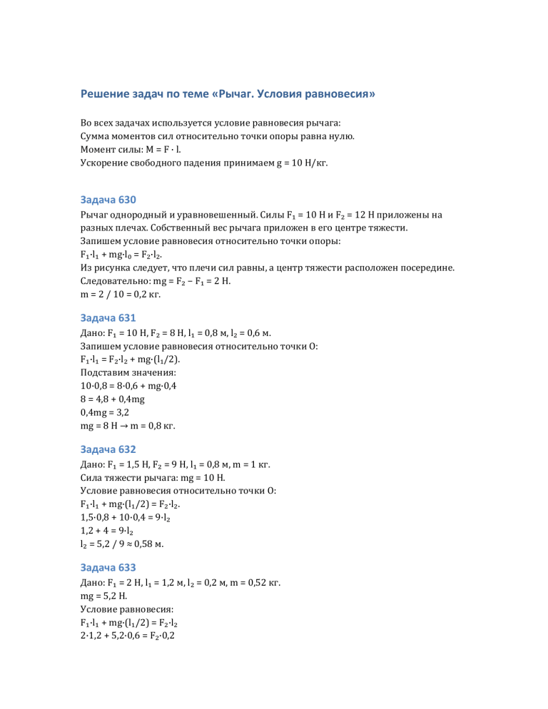Решение задач по теме «Рычаг. Условия равновесия» Во всех задачах используется условие равновесия рычага: Сумма моментов сил относительно точки опоры равна нулю. Момент силы: M = F · l. Ускорение свободного падения принимаем g = 10 Н/кг. Задача 630 Рычаг однородный и уравновешенный. Силы F₁ = 10 Н и F₂ = 12 Н приложены на разных плечах. Собственный вес рычага приложен в его центре тяжести. Запишем условие равновесия относительно точки опоры: F₁·l₁ + mg·l₀ = F₂·l₂. Из рисунка следует, что плечи сил равны, а центр тяжести расположен посередине. Следовательно: mg = F₂ − F₁ = 2 Н. m = 2 / 10 = 0,2 кг. Задача 631 Дано: F₁ = 10 Н, F₂ = 8 Н, l₁ = 0,8 м, l₂ = 0,6 м. Запишем условие равновесия относительно точки O: F₁·l₁ = F₂·l₂ + mg·(l₁/2). Подставим значения: 10·0,8 = 8·0,6 + mg·0,4 8 = 4,8 + 0,4mg 0,4mg = 3,2 mg = 8 Н → m = 0,8 кг. Задача 632 Дано: F₁ = 1,5 Н, F₂ = 9 Н, l₁ = 0,8 м, m = 1 кг. Сила тяжести рычага: mg = 10 Н. Условие равновесия относительно точки O: F₁·l₁ + mg·(l₁/2) = F₂·l₂. 1,5·0,8 + 10·0,4 = 9·l₂ 1,2 + 4 = 9·l₂ l₂ = 5,2 / 9 ≈ 0,58 м. Задача 633 Дано: F₁ = 2 Н, l₁ = 1,2 м, l₂ = 0,2 м, m = 0,52 кг. mg = 5,2 Н. Условие равновесия: F₁·l₁ + mg·(l₁/2) = F₂·l₂ 2·1,2 + 5,2·0,6 = F₂·0,2 2,4 + 3,12 = 0,2F₂ F₂ = 27,6 Н. Задача 634 Дано: F₁ = 8 Н, F₂ = 6 Н, m гири = 5 кг. Вес гири: P = 50 Н. Из условия равновесия следует: mg рычага = F₁ + P − F₂ = 52 Н. m рычага = 5,2 кг. Задача 635 Дано: L = 1 м, m = 12 кг, l = 0,2 м. Центр тяжести находится на расстоянии 0,5 м от конца. Плечо силы тяжести относительно точки подвеса: 0,3 м. Условие равновесия: F·l = mg·0,3 F·0,2 = 120·0,3 F = 180 Н.