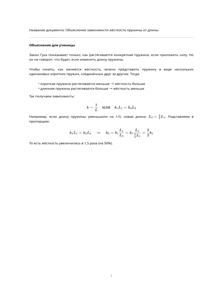 Название документа: Объяснение зависимости жёсткости пружины от длины Объяснение для ученицы Закон Гука показывает только, как растягивается конкретная пружина, если приложить силу. Но он не говорит, что будет, если изменить длину пружины. Чтобы понять, как меняется жёсткость, можно представить пружину в виде нескольких одинаковых коротких пружин, соединённых друг за другом. Тогда: • короткая пружина растягивается меньше → жёсткость больше • длинная пружина растягивается больше → жёсткость меньше Так получаем зависимость: k∼ 1 L или k1 L1 = k2 L2 Например, если длину пружины уменьшили на 1/3, новая длина: L2 = 23 L1 . Подставляем в пропорцию: k1 L1 = k2 L2 ⇒ k2 = k1 То есть жёсткость увеличилась в 1,5 раза (на 50%). 1 L1 L1 3 = k1 2 = k1 L2 2 3 L1