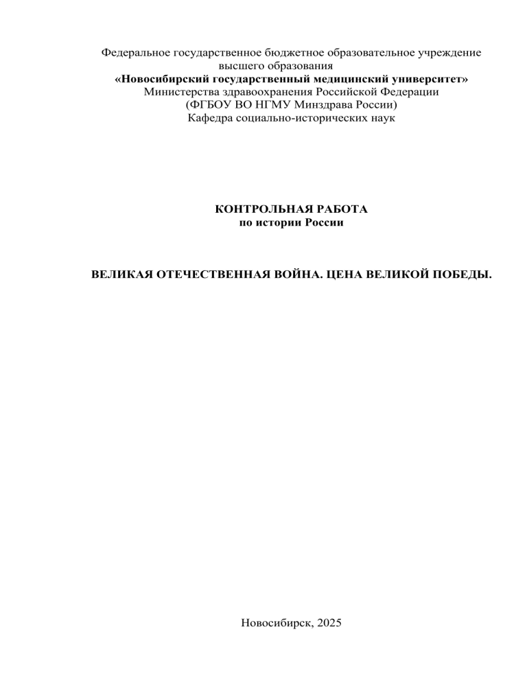 Федеральное государственное бюджетное образовательное учреждение высшего образования «Новосибирский государственный медицинский университет» Министерства здравоохранения Российской Федерации (ФГБОУ ВО НГМУ Минздрава России) Кафедра социально-исторических наук КОНТРОЛЬНАЯ РАБОТА по истории России ВЕЛИКАЯ ОТЕЧЕСТВЕННАЯ ВОЙНА. ЦЕНА ВЕЛИКОЙ ПОБЕДЫ. Новосибирск, 2025 План Введение 1. Подготовка Германии к нападению на СССР .............................................................. 4 2. Этапы Великой Отечественной войны 1941 – 1945 гг. И их анализ.......................... 9 3. Кому мешает победа? Фальсификация истории. ....................................................... 15 Заключение Приложение Список использованной литературы 2 Введение Актуальность. 22 июня 1941 г. началась Великая Отечественная война – важнейшее историческое событие XX столетия. В сердцах и душах наших соотечественников это день скорби и памяти о самой жестокой войне нашего народа против объединенных сил Западной Европы во главе с нацистской Германией, о героизме, стойкости и величии нашего народа, народа-победителя, одолевшего фашизм. В титаническом единоборстве столкнулись два мира – капиталистическая Европа в лице нацистской Германии и первое в мире социалистическое государство – СССР. Эта была схватка не на жизнь, а на смерть, которая унесла около 27 млн жизней советских людей. Германия стала активно готовить агрессию против Советского Союза со дня прихода нацистов к власти во главе с Гитлером – с начала 30-х годов прошлого столетия. Именно в те годы Гитлером был брошен вызов Кремлю. Это противостояние, переросшее в Великую Отечественную войну, закончилось победой нашего государства и сокрушительным поражением нацистской Германии и ее союзников в 1945 г. О Великой Отечественной войне написано множество книг, участники событий оставили свои воспоминания в мемуарах. Сохранилось множество документов, и даже кадры кинохроники. Но многое становится известно только сейчас, когда снимается секретность с документов. Несмотря на то, что проходит больше времени, картина тех событий становится только шире. Цель работы: изучить источники и цену победы Великой Отечественной войны 1941-1945 гг. Задачи работы состоят в том, чтобы: - изучить подготовку Германии к нападению на СССР; - рассмотреть и провести анализ этапов Великой Отечественной войны; - дать оценку фальсификация истории Великой Отечественной войны. 3 1. Подготовка Германии к нападению на СССР 8 декабря 1940 г. Адольф Гитлер подписал директиву № 21, в которой под грифом «Совершенно секретно. Только для командования!» содержался план нападения на Советский Союз. Плану было дано условное наименование «Барбаросса» – прозвище германского короля Фридриха I, который, став в 1155 г. императором «Священной Римской империи», проводил особо агрессивную захватническую политику и бесславно погиб во время Третьего крестового похода. Основную суть директивы, пожалуй, наиболее ярко отражала фраза, с которой она начиналась: «Германские вооруженные силы должны быть готовы разбить Советскую Россию в ходе кратковременной кампании еще до того, как будет закончена война против Англии… Приказ о стратегическом развертывании вооруженных сил против Советского Союза я отдам в случае необходимости за восемь недель до намеченного срока начала операций. Приготовления, требующие более продолжи