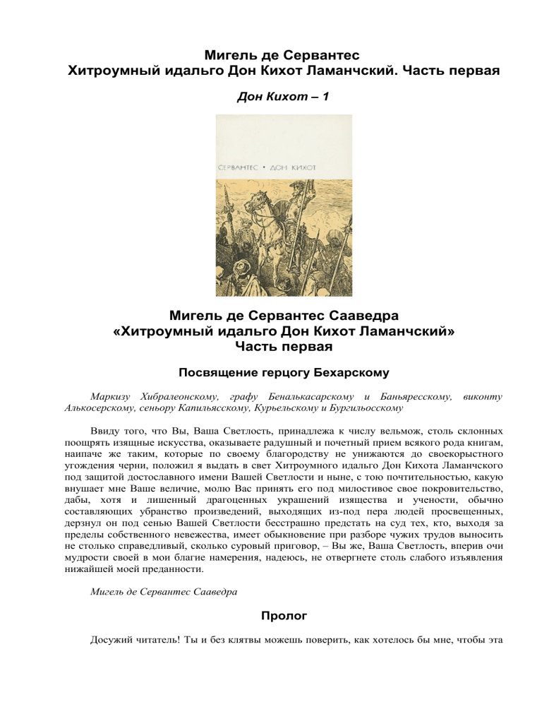 Мигель де Сервантес Хитроумный идальго Дон Кихот Ламанчский. Часть первая Дон Кихот – 1 Мигель де Сервантес Сааведра «Хитроумный идальго Дон Кихот Ламанчский» Часть первая Посвящение герцогу Бехарскому Маркизу Хибралеонскому, графу Беналькасарскому и Баньяресскому, виконту Алькосерскому, сеньору Капильясскому, Курьельскому и Бургильосскому Ввиду того, что Вы, Ваша Светлость, принадлежа к числу вельмож, столь склонных поощрять изящные искусства, оказываете радушный и почетный прием всякого рода книгам, наипаче же таким, которые по своему благородству не унижаются до своекорыстного угождения черни, положил я выдать в свет Хитроумного идальго Дон Кихота Ламанчского под защитой достославного имени Вашей Светлости и ныне, с тою почтительностью, какую внушает мне Ваше величие, молю Вас принять его под милостивое свое покровительство, дабы, хотя и лишенный драгоценных украшений изящества и учености, обычно составляющих убранство произведений, выходящих из-под пера людей просвещенных, дерзнул он под сенью Вашей Светлости бесстрашно предстать на суд тех, кто, выходя за пределы собственного невежества, имеет обыкновение при разборе чужих трудов выносить не столько справедливый, сколько суровый приговор, – Вы же, Ваша Светлость, вперив очи мудрости своей в мои благие намерения, надеюсь, не отвергнете столь слабого изъявления нижайшей моей преданности. Мигель де Сервантес Сааведра Пролог Досужий читатель! Ты и без клятвы можешь поверить, как хотелось бы мне, чтобы эта книга, плод моего разумения, являла собою верх красоты, изящества и глубокомыслия. Но отменить закон природы, согласно которому всякое живое существо порождает себе подобное, не в моей власти. А когда так, то что же иное мог породить в темнице 1 бесплодный мой и неразвитый ум, если не повесть о костлявом, тощем, взбалмошном сыне, полном самых неожиданных мыслей, доселе никому не приходивших в голову, – словом, о таком, какого только и можно было породить в темнице, местопребывании всякого рода помех, обиталище одних лишь унылых звуков. Тихий уголок, покой, приветные долины, безоблачные небеса, журчащие ручьи, умиротворенный дух – вот что способно оплодотворить самую бесплодную музу и благодаря чему ее потомство, едва появившись на свет, преисполняет его восторгом и удивлением. Случается иной раз, что у кого-нибудь родится безобразный и нескладный сын, однако же любовь спешит наложить повязку на глаза отца, и он не только не замечает его недостатков, но, напротив того, в самых этих недостатках находит нечто остроумное и привлекательное и в разговоре с друзьями выдает их за образец сметливости и грации. Я же только считаюсь отцом Дон Кихота, – на самом деле я его отчим, и я не собираюсь идти проторенной дорогой и, как это делают иные, почти со слезами на глазах умолять тебя, дражайший читатель, простить моему детищу его недостатки или же посмотреть на них сквозь пальцы: ведь ты ему не родня и не друг, в твоем теле есть душа, воля у тебя столь же свободна, как у всякого многоопытного мужа, у себя дома ты так же властен распоряжаться, как король властен установить любой налог, и тебе должна быть известна поговорка: «Дай накроюсь моим плащом – тогда я расправлюсь и с королем». Все это избавляет тебя от необходимости льстить моему герою и освобождает от каких бы то ни было обяза