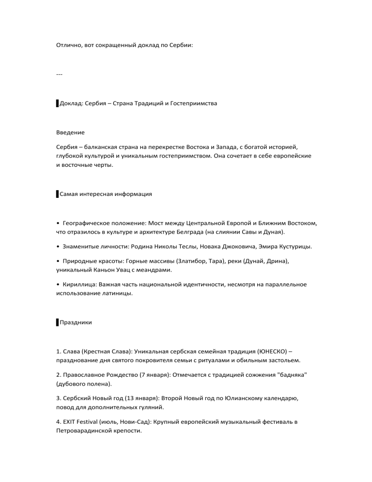 Отлично, вот сокращенный доклад по Сербии: --- ▌Доклад: Сербия – Страна Традиций и Гостеприимства Введение Сербия – балканская страна на перекрестке Востока и Запада, с богатой историей, глубокой культурой и уникальным гостеприимством. Она сочетает в себе европейские и восточные черты. ▌Самая интересная информация • Географическое положение: Мост между Центральной Европой и Ближним Востоком, что отразилось в культуре и архитектуре Белграда (на слиянии Савы и Дуная). • Знаменитые личности: Родина Николы Теслы, Новака Джоковича, Эмира Кустурицы. • Природные красоты: Горные массивы (Златибор, Тара), реки (Дунай, Дрина), уникальный Каньон Увац с меандрами. • Кириллица: Важная часть национальной идентичности, несмотря на параллельное использование латиницы. ▌Праздники 1. Слава (Крестная Слава): Уникальная сербская семейная традиция (ЮНЕСКО) – празднование дня святого покровителя семьи с ритуалами и обильным застольем. 2. Православное Рождество (7 января): Отмечается с традицией сожжения "бадняка" (дубового полена). 3. Сербский Новый год (13 января): Второй Новый год по Юлианскому календарю, повод для дополнительных гуляний. 4. EXIT Festival (июль, Нови-Сад): Крупный европейский музыкальный фестиваль в Петроварадинской крепости. 5. Фестиваль трубы в Гуче (август): Всемирно известный фестиваль традиционной духовой музыки. ▌Традиции 1. Гостеприимство (Gostoprimstvo): Исключительное радушие к гостям; отказ от угощения может быть невежливым. 2. Кафа и Ракия: Культура питья сербского кофе и традиционного фруктового бренди — неотъемлемая часть общения. 3. Троекратный поцелуй: Принято обмениваться тремя поцелуями в щеку при встрече. 4. Значение семьи: Семья – основа общества; крепкие связи и уважение к старшим – фундаментальные ценности. 5. Кулинария: Богатое разнообразие вкусов (плескавица, чевапчичи, сарма, айвар, каймак, гибаница) – часть культурного опыта. Заключение Сербия – это страна с сильным характером, где история и традиции формируют уникальную атмосферу искреннего гостеприимства и живой культуры.Отлично! Вот 3 вопроса по докладу о Сербии: 1. Какая уникальная семейная традиция Сербии признана ЮНЕСКО и в чём её суть? 2. Назовите двух всемирно известных людей сербского происхождения, упомянутых в докладе, и их основные сферы деятельности. 3. Помимо Белграда, какой ещё крупный город Сербии известен своим масштабным музыкальным фестивалем и в какой исторической локации он проходит?