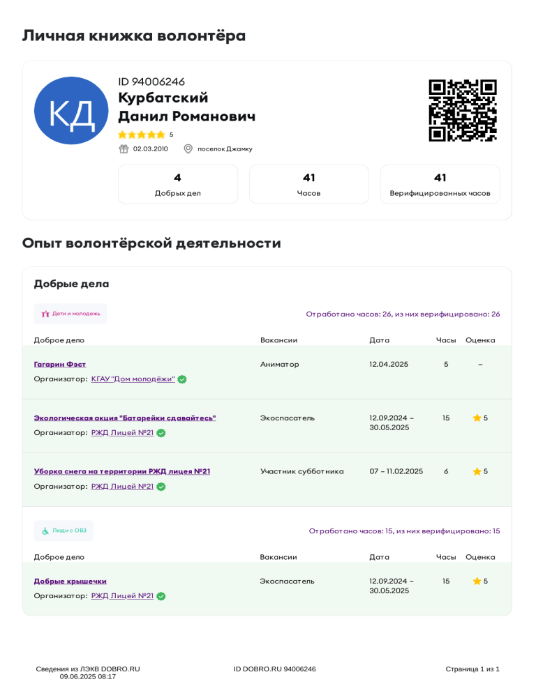 Личная книжка волонтёра ID 94006246 Курбатский Данил Романович 5 02.03.2010 поселок Джамку 4 41 41 Добрых дел Часов Верифицированных часов Опыт волонтёрской деятельности Добрые дела От работ ано часов: 26, из них верифицировано: 26 Дети и молодежь Доброе дело Вакансии Дат а Часы Оценка Гагарин Фэст Анимат ор 12.04.2025 5 — Экоспасат ель 12.09.2024 – 30.05.2025 15 5 Участ ник суббот ника 07 – 11.02.2025 6 5 Организат ор: КГАУ "Дом молодёжи" Экологическая акция "Батарейки сдавайтесь" Организат ор: РЖД Лицей №21 Уборка снега на территории РЖД лицея №21 Организат ор: РЖД Лицей №21 От работ ано часов: 15, из них верифицировано: 15 Люди с ОВЗ Доброе дело Вакансии Дат а Добрые крышечки Экоспасат ель 12.09.2024 – 30.05.2025 Организат ор: РЖД Лицей №21 Сведения из ЛЭКВ DOBRO.RU 09.06.2025 08:17 ID DOBRO.RU 94006246 Часы Оценка 15 5 Страница 1 из 1