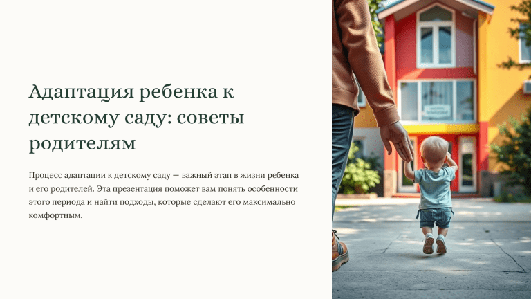 Адаптация ребенка к детскому саду: советы родителям Процесс адаптации к детскому саду — важный этап в жизни ребенка и его родителей. Эта презентация поможет вам понять особенности этого периода и найти подходы, которые сделают его максимально комфортным. Введение Кризис 3 лет: «Я сам!» Профессор Нина Михайловна Аскарина сравнивает адаптацию ребенка с пересадкой дерева: несмотря на все усилия, оно болеет, пока не приживется. Опыт показывает, что сложнее всего адаптация проходит у детей 3-3,5 лет. Это совпадает с кризисом развития личности, который характеризуется стремлением к самостоятельности и самоутверждению. Положительные стороны кризиса Осознание «Я» Ребенок начинает осознавать свою индивидуальность. Стремление к самостоятельности Гордость за достижения Активное развитие воли и гордиться результатом. Стремление добиваться целей и самолюбия. Все эти новые черты являются положительным следствием кризиса для ребенка, способствуя его развитию. Трудности кризиса 3 лет Обострение отношений Негативизм Эмоциональные всплески Появление деспотизма, Стремление сделать все Капризы, крики, топанье ногами своеволия, упрямства, наоборот, отказ подчиняться. при невыполнении просьб. строптивости. Этот период труднее переносят дети, так как они не понимают своего поведения и не умеют сдерживать эмоции. Поддержка самостоятельности Позвольте малышу почувствовать себя независимым в том, чему он уже научился: самостоятельно кушать, одеваться, заправлять кровать. Воспитывайте слуховое внимание: приучайте слышать то, о чем вы просите. Поощряйте малейшие успехи, хвалите за инициативу. Развитие любознательности Знакомство с миром Отражение впечатлений Ценность рисунков Позвольте ребенку изучать то, что его Предложите нарисовать увиденное, Главное в рисунке — выражение интересует, например, башенный проявляйте чуткость к детским чувств и настроений, а не кран. рисункам. художественная достоверность. Развитие игровых умений Если ребенок бесцельно играет, помогите ему: подскажите новые действия, направления игры. Демонстрируйте свои действия (сборы на работу), делитесь впечатлениями о дне. Важность общения 1 Возраст «почемучек» 2 3 Целенаправленное общение Поощрение активности познаний, развивайте речь Ежедневно выделяйте время для побуждайте к самостоятельности ребенка, отвечая на все вопросы. разговоров, даже если придется и инициативе. Не упускайте время жажды искать ответы в энциклопедии. Увлекайте ребенка темами, Совместные игры Интересуйтесь играми малыша, помогайте развивать сюжеты, подсказывайте новые роли. Действуйте гибко и ненавязчиво, уважайте желания и чувства ребенка, давая ему проявить инициативу. Общение со сверстниками Приглашайте друзей Домашний театр Привлекайте родителей Устраивайте детские праздники с Покажите кукольный спектакль, Пусть друзья помогут обустроить продуманной программой. сделанный своими руками. ширму и примут участие в развлечениях. Такие праздники запомнятся всем, принесут радость и создадут хорошее настроение.