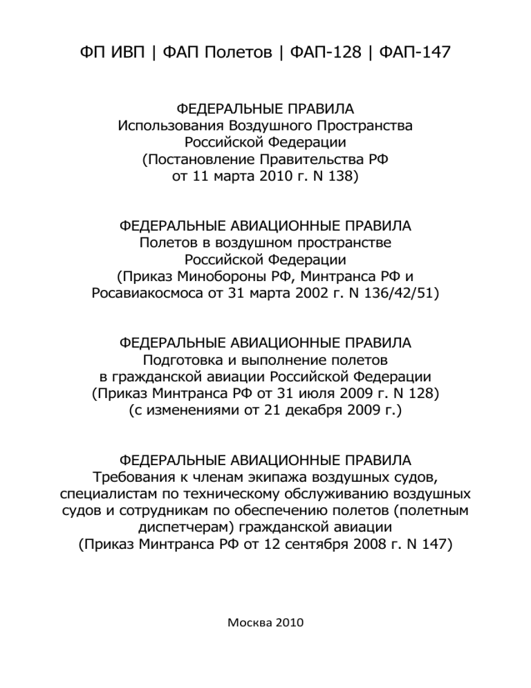 ФП ИВП | ФАП Полетов | ФАП-128 | ФАП-147 ФЕДЕРАЛЬНЫЕ ПРАВИЛА Использования Воздушного Пространства Российской Федерации (Постановление Правительства РФ от 11 марта 2010 г. N 138) ФЕДЕРАЛЬНЫЕ АВИАЦИОННЫЕ ПРАВИЛА Полетов в воздушном пространстве Российской Федерации (Приказ Минобороны РФ, Минтранса РФ и Росавиакосмоса от 31 марта 2002 г. N 136/42/51) ФЕДЕРАЛЬНЫЕ АВИАЦИОННЫЕ ПРАВИЛА Подготовка и выполнение полетов в гражданской авиации Российской Федерации (Приказ Минтранса РФ от 31 июля 2009 г. N 128) (с изменениями от 21 декабря 2009 г.) ФЕДЕРАЛЬНЫЕ АВИАЦИОННЫЕ ПРАВИЛА Требования к членам экипажа воздушных судов, специалистам по техническому обслуживанию воздушных судов и сотрудникам по обеспечению полетов (полетным диспетчерам) гражданской авиации (Приказ Минтранса РФ от 12 сентября 2008 г. N 147) Москва 2010 Постановление Правительства РФ от 11 марта 2010 г. N 138 "Об утверждении Федеральных правил использования воздушного пространства Российской Федерации" В соответствии со статьей 2 Воздушного кодекса Российской Федерации Правительство Российской Федерации постановляет: 1. Утвердить прилагаемые Федеральные правила использования воздушного пространства Российской Федерации. 2. Признать утратившими силу: постановление Правительства Российской Федерации от 22 сентября 1999 г. N 1084 "Об утверждении Федеральных правил использования воздушного пространства Российской Федерации" (Собрание законодательства Российской Федерации, 1999, N 40, ст. 4861); пункт 11 изменений, которые вносятся в акты Правительства Российской Федерации по вопросам лицензирования отдельных видов деятельности, утвержденных постановлением Правительства Российской Федерации от 14 декабря 2006 г. N 767 "Об изменении и признании утратившими силу некоторых актов Правительства Российской Федерации по вопросам лицензирования отдельных видов деятельности" (Собрание законодательства Российской Федерации, 2006, N 52, ст. 5587). 3. Настоящее постановление вступает в силу с 1 ноября 2010 г. Председатель Правительства Российской Федерации В. Путин ФП ИВП. Стр. 1 Приложение к Постановлению Правительства РФ от 11 марта 2010 г. N 138 Федеральные правила использования воздушного пространства Российской Федерации (утв. постановлением Правительства РФ от 11 марта 2010 г. N 138) I. Общие положения 1. Настоящие Федеральные правила, разработанные в соответствии с Воздушным кодексом Российской Федерации и Конвенцией о международной гражданской авиации, подписанной в г. Чикаго 7 декабря 1944 г., устанавливают порядок использования воздушного пространства Российской Федерации в интересах экономики и обороны страны, в целях удовлетворения потребностей пользователей воздушного пространства, обеспечения безопасности использования воздушного пространства. 2. В настоящих Федеральных правилах используются следующие определения: "аварийное оповещение" - уведомление поисково-спасательных служб о воздушных судах, терпящих бедствие; "аэроузел" - объединение близко расположенных районов аэродромов (вертодромов), которые имеют общие границы и организация выполнения полетов с которых требует согласования и координирования; "аэронавигационные данные" - сведения об аэродромах, аэроузлах, элементах структуры воздушного пространства и средствах радиотехнического обеспечения, необходимые для организации и выполнения полетов; "аэронавигационная
