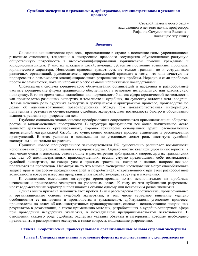 Судебная экспертиза в гражданском, арбитражном, административном и уголовном процессе Светлой памяти моего отца заслуженного деятеля науки, профессора Рафаила Самуиловича Белкина посвящаю эту книгу Введение Социально-экономические процессы, происходящие в стране в последние годы, укрепляющиеся рыночные отношения, тенденции к построению правового государства обусловливают растущую общественную потребность в высококвалифицированной юридической помощи гражданам и юридическим лицам. У многих граждан и хозяйствующих субъектов постоянно возникают проблемы юридического характера. Невысокая правовая грамотность не только граждан, но и сотрудников различных организаций, руководителей, предпринимателей приводит к тому, что они зачастую не подозревают о возможности квалифицированного разрешения этих проблем. Нередко и сами проблемы просто не замечаются, пока не напомнят о себе самыми неприятными последствиями. Сложившаяся система юридического обслуживания организаций и населения и разнообразные частные юридические фирмы традиционно обеспечивают в основном нотариальную или адвокатскую поддержку. В то же время такая важнейшая для нормального бизнеса сфера юридической деятельности, как производство различных экспертиз, в том числе и судебных, по существу остается terra incognita. Весьма невелика роль судебных экспертиз в гражданском и арбитражном процессе, производстве по делам об административных правонарушениях. Между тем доказательственная информация, полученная в результате осуществления судебных экспертиз, дает возможность быстро и обоснованно выносить решения при разрешении дел. Глубокие социально-экономические преобразования сопровождаются криминализацией общества, ростом и видоизменением преступности. В структуре преступности все более значительное место занимает деятельность организованных, хорошо технически оснащенных групп, располагающих значительной материальной базой, что существенно осложняет процесс выявления и расследования преступлений. В этих условиях в доказывании по уголовным делам роль института судебной экспертизы значительно возрастает. Принятие нового процессуального законодательства РФ существенно расширяет возможности использования специальных знаний в судопроизводстве. Однако многие квалифицированные юристы, в том числе судьи и адвокаты, участвующие в рассмотрении арбитражных споров, других гражданских дел, дел об административных правонарушениях, весьма смутно представляют себе возможности судебной экспертизы, не говоря уже о простых гражданах, которые в данном вопросе всецело полагаются на правоведов. Несмотря на то что многие экспертные исследования могут способствовать защите прав и интересов предпринимателей и потребителей, открывающиеся при этом разнообразные возможности вовсе не известны представителям хозяйствующих структур и населению. К сожалению, имеющаяся литература ориентирована почти исключительно на проблемы назначения и производства экспертиз по уголовным делам. К тому же эти публикации разрознены, носят ведомственный характер и посвящаются обычно одному или нескольким родам экспертиз. Данная книга призвана заполнить этот пробел. В ней рассмотрены теоретические, процессуальные и организационные основы судебной экспертизы, в том числ