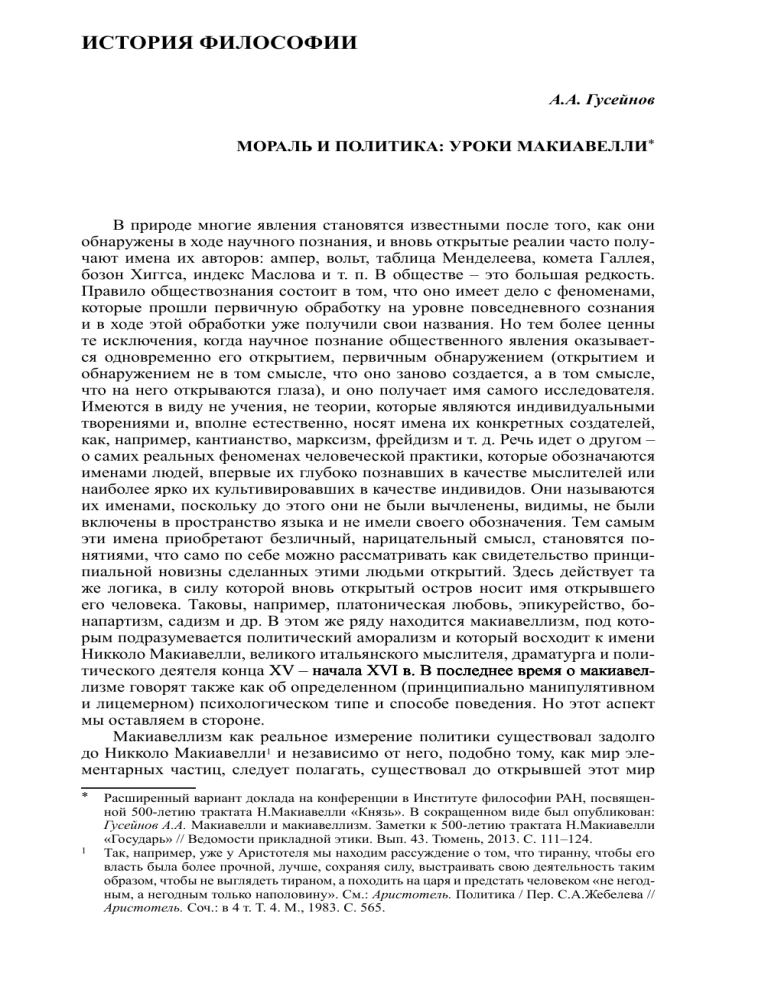 ИСТОРИЯ ФИЛОСОФИИ А.А. Гусейнов МОРАЛЬ И ПОЛИТИКА: УРОКИ МАКИАВЕЛЛИ* В природе многие явления становятся известными после того, как они обнаружены в ходе научного познания, и вновь открытые реалии часто получают имена их авторов: ампер, вольт, таблица Менделеева, комета Галлея, бозон Хиггса, индекс Маслова и т. п. В обществе – это большая редкость. Правило обществознания состоит в том, что оно имеет дело с феноменами, которые прошли первичную обработку на уровне повседневного сознания и в ходе этой обработки уже получили свои названия. Но тем более ценны те исключения, когда научное познание общественного явления оказывается одновременно его открытием, первичным обнаружением (открытием и обнаружением не в том смысле, что оно заново создается, а в том смысле, что на него открываются глаза), и оно получает имя самого исследователя. Имеются в виду не учения, не теории, которые являются индивидуальными творениями и, вполне естественно, носят имена их конкретных создателей, как, например, кантианство, марксизм, фрейдизм и т. д. Речь идет о другом – о самих реальных феноменах человеческой практики, которые обозначаются именами людей, впервые их глубоко познавших в качестве мыслителей или наиболее ярко их культивировавших в качестве индивидов. Они называются их именами, поскольку до этого они не были вычленены, видимы, не были включены в пространство языка и не имели своего обозначения. Тем самым эти имена приобретают безличный, нарицательный смысл, становятся понятиями, что само по себе можно рассматривать как свидетельство принципиальной новизны сделанных этими людьми открытий. Здесь действует та же логика, в силу которой вновь открытый остров носит имя открывшего его человека. Таковы, например, платоническая любовь, эпикурейство, бонапартизм, садизм и др. В этом же ряду находится макиавеллизм, под которым подразумевается политический аморализм и который восходит к имени Никколо Макиавелли, великого итальянского мыслителя, драматурга и политического деятеля конца XV���������������������������������������������� ������������������������������������������������ – начала XVI��������������������������������� ������������������������������������ в. В последнее время о макиавеллизме говорят также как об определенном (принципиально манипулятивном и лицемерном) психологическом типе и способе поведения. Но этот аспект мы оставляем в стороне. Макиавеллизм как реальное измерение политики существовал задолго до Никколо Макиавелли1 и независимо от него, подобно тому, как мир элементарных частиц, следует полагать, существовал до открывшей этот мир * 1 Расширенный вариант доклада на конференции в Институте философии РАН, посвященной 500-летию трактата Н.Макиавелли «Князь». В сокращенном виде был опубликован: Гусейнов А.А. Макиавелли и макиавеллизм. Заметки к 500-летию трактата Н.Макиавелли «Государь» // Ведомости прикладной этики. Вып. 43. Тюмень, 2013. С. 111–124. Так, например, уже у Аристотеля мы находим рассуждение о том, что тиранну, чтобы его власть была более прочной, лучше, сохраняя силу, выстраивать свою деятельность таким образом, чтобы не выглядеть тираном, а походить на царя и предстать человеком «не негодным, а негодным только наполовину».