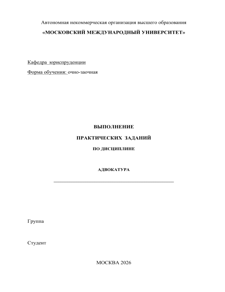 Автономная некоммерческая организация высшего образования «МОСКОВСКИЙ МЕЖДУНАРОДНЫЙ УНИВЕРСИТЕТ» Кафедра юриспруденции Форма обучения: очно-заочная ВЫПОЛНЕНИЕ ПРАКТИЧЕСКИХ ЗАДАНИЙ ПО ДИСЦИПЛИНЕ АДВОКАТУРА _____________________________________________________ Группа Студент МОСКВА 2026 Задание 1. Иванова заключила с адвокатом соглашение на оказание юридической помощи по делу о разделе совместно нажитого имущества. При этом, на момент заключения соглашения и представления интересов Ивановой в суде статус у адвоката был приостановлен, о чем доверителю было не известно. Имеются ли в действиях адвоката нарушения норм законодательства об адвокатской деятельности и адвокатуре? Если да, то укажите какие нормы закона нарушены адвокатом. Ответ: «Да, в действиях адвоката имеются нарушения норм законодательства об адвокатской деятельности и адвокатуре. Согласно статье 16 Федерального закона от 31 мая 2002 года №63-ФЗ «Об адвокатской деятельности и адвокатуре в Российской Федерации», лицо, статус адвоката которого приостановлен, не вправе осуществлять адвокатскую деятельность. Нарушение этого положения влечёт прекращение статуса адвоката. Нормы, которые нарушил адвокат 1. Пункт 3.1 статьи 16 ФЗ №63-ФЗ прямо запрещает лицу с приостановленным статусом адвоката осуществлять адвокатскую деятельность, а также занимать выборные должности в органах адвокатской палаты или Федеральной палаты адвокатов. В описанной ситуации адвокат заключил соглашение на оказание юридической помощи и представлял интересы Ивановой в суде, что является нарушением данного запрета. 2. Статья 1 ФЗ №63-ФЗ определяет квалифицированную юридическую адвокатскую помощь, деятельность оказываемую как лицами, получившими статус адвоката в установленном законом порядке. Поскольку статус адвоката был приостановлен, его действия по оказанию юридической помощи не могли считаться законными. 3. Статья 25 ФЗ №63-ФЗ устанавливает, что адвокатская деятельность осуществляется на основе соглашения между адвокатом и доверителем. 2 Однако в ситуации, когда статус адвоката приостановлен, он не имеет права заключать такие соглашения и выполнять обязательства по ним. Последствия нарушения Прекращение статуса адвоката. Нарушение пункта 3.1 статьи 16 ФЗ №63- ФЗ влечёт прекращение статуса адвоката. Дисциплинарная квалифицированы ответственность. Действия как нарушение адвоката требований могут быть законодательства об адвокатской деятельности и адвокатуре, а также Кодекса профессиональной этики адвоката, что является основанием для применения мер дисциплинарной ответственности. Недействительность соглашения. Соглашение, заключённое адвокатом с приостановленным статусом, может быть признано недействительным, так как оно противоречит закону. Это может повлечь правовые последствия для обеих сторон, включая возможность возмещения Ивановой понесённых убытков. Дополнительные аспекты Тот факт, что Иванова не знала о приостановлении статуса адвоката, не освобождает последнего от ответственности за нарушение закона. Однако это может повлиять на оценку действий адвоката с точки зрения этики и на размер возможных компенсаций для доверителя. Для привлечения адвоката к ответственности Иванова может обратиться в совет адвокатской палаты, членом которой он является, либо в территориальный орган юстиции