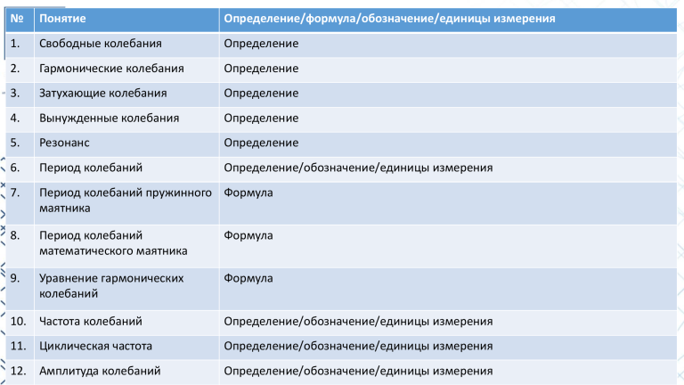 № Понятие Определение/формула/обозначение/единицы измерения 1. Свободные колебания Определение 2. Гармонические колебания Определение 3. Затухающие колебания Определение 4. Вынужденные колебания Определение 5. Резонанс Определение 6. Период колебаний Определение/обозначение/единицы измерения 7. Период колебаний пружинного Формула маятника 8. Период колебаний математического маятника Формула 9. Уравнение гармонических колебаний Формула 10. Частота колебаний Определение/обозначение/единицы измерения 11. Циклическая частота Определение/обозначение/единицы измерения 12. Амплитуда колебаний Определение/обозначение/единицы измерения • Какие условия нужны для существования колебаний? • Наличие положения равновесия, возвращающая сила, возможность по инерции пройти положение равновесия. Колебательный̆ контур. Свободные электромагнитные колебания в идеальном колебательном контуре. Аналогия между механическими и электромагнитными колебаниями. • Периодические изменения заряда, силы тока и напряжения называются электромагнитными колебаниями. • Простейшая система, в которой могут происходить электромагнитные колебания состоит из конденсатора и катушки, присоединенной к его обкладкам, и называется колебательным контуром Механические колебания Электромагнитные колебания Физическая величина Обозначен Физическая величина ие Координата x Электрический заряд Обозначе ние q = x I = q 1 С L Скорость Коэффициент жесткости Масса k m Сила тока Величина, обратная емкости Индуктивность 𝑞2 • 𝑊э = − энергия электрического поля 2𝐶 𝐿𝑖 2 • 𝑊𝑚 = − энергия магнитного поля 2 2 2 𝑞2 𝐿𝑖 2 𝑞𝑚 𝐿𝐼𝑚 • 𝑊 = 𝑊э + 𝑊𝑚 = + = = − 2𝐶 2 2𝐶 2 полная энергия электромагнитного поля Механические колебания Электромагнитные колебания Физическая величина Обозначен Физическая величина Обозначе ие ние Координата Скорость Коэффициент жесткости Масса Потенциальная энергия Кинетическая энергия x = x k m 𝑘𝑥 2 𝑊𝑝 = 2 𝑚2 𝑊𝑘 = 2 Электрический заряд Сила тока Величина, обратная емкости Индуктивность Энергия электрического поля Энергия магнитного поля q I = q 1 С L 𝑞2 𝑊э = 2𝐶 𝐿𝑖 2 𝑊𝑚 = 2 𝑘 • 𝑎𝑥 = − 𝑥 𝑚 1 • 𝑞" = − 𝑞 𝐿𝐶 • 𝑇 = 2𝜋 𝑚 𝑘 • 𝑇 = 2𝜋 𝐿𝐶 • 𝑥 = 𝑥𝑚 𝑐𝑜𝑠𝜔0 𝑡 • 𝑞 = 𝑞𝑚 𝑐𝑜𝑠𝜔0 𝑡 • 𝑖 = 𝑞 = −𝜔0 𝑞𝑚 𝑠𝑖𝑛𝜔0 𝑡 = 𝐼𝑚 𝑐𝑜𝑠 𝜋 𝜔0 𝑡 + 2 • Д/з параграф 17 – 19, стр. 85 задача 1.
