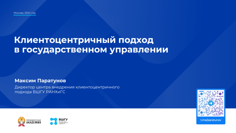 Москва, 2024 год Клиентоцентричный подход в государственном управлении Максим Паратунов Директор центра внедрения клиентоцентричного подхода ВШГУ РАНХиГС О спикере Максим Паратунов Директор центра внедрения клиентоцентричного подхода ВШГУ РАНХиГС Способствую системным изменениям в государстве и бизнесе реализую проекты клиентоцентричных трансформаций, помогаю создавать новые, развивать существующие продукты и выводить их на рынок, а также улучшать клиентский опыт Сопровождаю команды в изменениях и отвечаю за глубокую и бережную трансформацию на трех уровнях личность лидера, командная работа и деятельность организации 2 О центре Цель Сформировать культуру клиентоцентричности в органах публичной власти Задача Обучение всей вертикали власти по программам клиентоцентричности 3 Задача Разработка линейки специализированных образовательных программ по клиентоцентричности Задача Внедрение и сопровождение клиентоцентричных трансформаций через менторинг руководителей и поддержку команд Цели на сегодня 01 02 03 Создать понимание Познакомить с ценностями Донести эффекты и выгоды клиентоцентричного подхода в госуправлении внедрения клиентоцентричного подхода в органы власти клиентоцентричного подхода в госуправлении 4 Основы клиентоцентричности Клиентоориентированность Клиентоцентричность Человекоцентричность 6 Клиентоцентричность — концепция государственного управления, ориентированная на постоянное совершенствование процессов удовлетворения потребностей клиента на основе непрерывного изучения клиентского опыта Что такое клиентоцентричное госуправление? 01 02 03 Способ предоставления государственных услуг, Доступ к качественным сервисам, Постоянное совершенствование и реинжиниринг при котором обеспечивается соблюдение индивидуальных интересов и особенностей каждого их получателя услугам, платформам наиболее удобными для пользователя способами 8 объектов, процессов, организационных структур и полномочий в интересах внутренних и внешних клиентов с использованием регулярной обратной связи от них Суть клиентоцентричности заключается в том, чтобы: 9 1 Рассматривать государство как мега-провайдера услуг и сервисов 2 Поддерживать высокий уровень качества взаимодействия человека с государством 3 Предоставлять возможность человеку выбирать комфортную конфигурацию такого взаимодействия Внутренний клиент — государственные служащие Российской Федерации, муниципальные служащие, работники и сотрудники органа или организации На что стоит обратить внимание при работе с внутренним клиентом: Кто мой внутренний клиент и для кого я являюсь внутренним клиентом? 01 Понимаю ли я что движет внутренними клиентами: их цели, задачи, потребности? 02 03 11 Как перестроить свое отношение и начать воспринимать знакомого коллегу как клиента, которому нужно помочь? На что стоит обратить внимание при работе с внутренним клиентом: Как сократить и упростить рабочие процедуры, чтобы внутренним клиентам было удобнее и проще работать со мной? 04 Как облегчить подчиненным, внутренним клиентам, выполнение трудных задач? 05 06 12 Как быстро и правильно обеспечить руководителю как клиенту необходимую информацию? Внешний клиент — это физические и юридические лица, взаимодействующие с государством с целью удовлетворения своих п