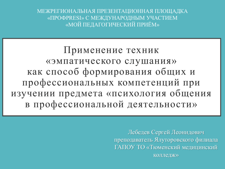 МЕЖРЕГИОНАЛЬНАЯ ПРЕЗЕНТАЦИОННАЯ ПЛОЩАДКА «ПРОФPRESI» С МЕЖДУНАРОДНЫМ УЧАСТИЕМ «МОЙ ПЕДАГОГИЧЕСКИЙ ПРИЁМ» Применение техник «эмпатического слушания» как способ формирования общих и профессиональных компетенций при изучении предмета «психология общения в профессиональной деятельности» Лебедев Сергей Леонидович преподаватель Ялуторовского филиала ГАПОУ ТО «Тюменский медицинский колледж» Несколько определений эмпатии разных авторов: • Эмпатия — это: • способ существования с другим человеком, возможность войти во внутренний мир другого и быть в нём как дома. К. Роджерс. • совокупность теоретических построений, которые касаются реакции отдельного человека на переживания других. М. Дэвис. • способность понимать переживания другой личности и сопереживать ей в процессе межличностных отношений. К. К. Платонов • способность погрузиться в эмоциональное состояние другого человека после его осознания. А. Г. Ковалев. Эмпáтия — о сознанное сопереживание текущему эмоциональному со стоянию другого человека без потери ощущения внешнего происхождения этого переживания. Соответственно эмпа́ т — это человек с развитой спо собно стью к эмпатии. В И Д Ы И Х А РА К Т Е Р И С Т И К И Э М О Ц И О Н А Л Ь Н Ы Х С О С Т ОЯ Н И Й . Эмоциональный мир личности представлен пятью компонентами: 1. эмоциями; 2. аффектами; 3. чувствами; 4. настроениями; 5. стрессами. В И Д Ы И Х А РА К Т Е Р ИС ТИК И ЭМ О Ц И О Н А ЛЬ Н ЫХ СО СТО Я НИЙ. • Эмоция – это переживание субъекта в конкретный миг его жизни, возникают мгновенно и могут меняться очень быстро. это форма отражения действительности, протекающая в виде переживаний. Аффект – психофизиологический процесс, который стремительно овладевает субъектом и очень выразительно протекает. Он характеризуется значительными изменениями в сознании и нарушением контроля личности над своим поведением, потерей самообладания. Чувства -это более устойчивые психоэмоциональные состояния в сравнении с эмоциями и аффектом. Чувства – сложная по своей структуре разновидность эмоциональных состояний. Настроение – достаточно длительное по времени эмоциональное состояние, окрашивающее все переживания человека и влияющее на его поведение. Термином «стресс» принято обозначать особые переживания чувств, которые подобны по своим характеристикам аффекту и аналогичны по своей продолжительности настроениям. ФА К ТО РЫ, В Л ИЯ Ю ЩИЕ НА ЭМО Ц ИОНА ЛЬ НОЕ СО СТО Я НИЕ Ч Е Л О В Е КА Биологические — генетика, гормональные изменения и состояние здоровья. Социальные — качество и характер межличностных отношений, культурные особенности. Психологические — уровень стресса, личностные черты, прошлый опыт и способы мышления. Окружающая среда — жилищные условия, климат и доступность рекреационных зон. ЧТО ТАКОЕ СТРЕСС? «...синдром, вызываемый разными повреждающими агентами» Ганс Селье, 4 июля 1936 года «… общая адаптивная реакция организма в ответ на угрозу нарушения гомеостаза» Кассиль Г.Н., 1983 «…стресс - проблема эмоционального стресса...» Судаков К.В., 1980 Различают два вида стресса: 1. Конструктивный, положительный (эустресс) 2. Деструктивный, отрицательный (дистресс) СТРЕСС - обычное явление, это естественная часть человеческого существования. Проблему для здоровья представляет чрезмерный стресс ТЕОРИЯ ПЯТИ СТАДИЙ ПРИНЯТИЯ • Отрицание • гнев/агре