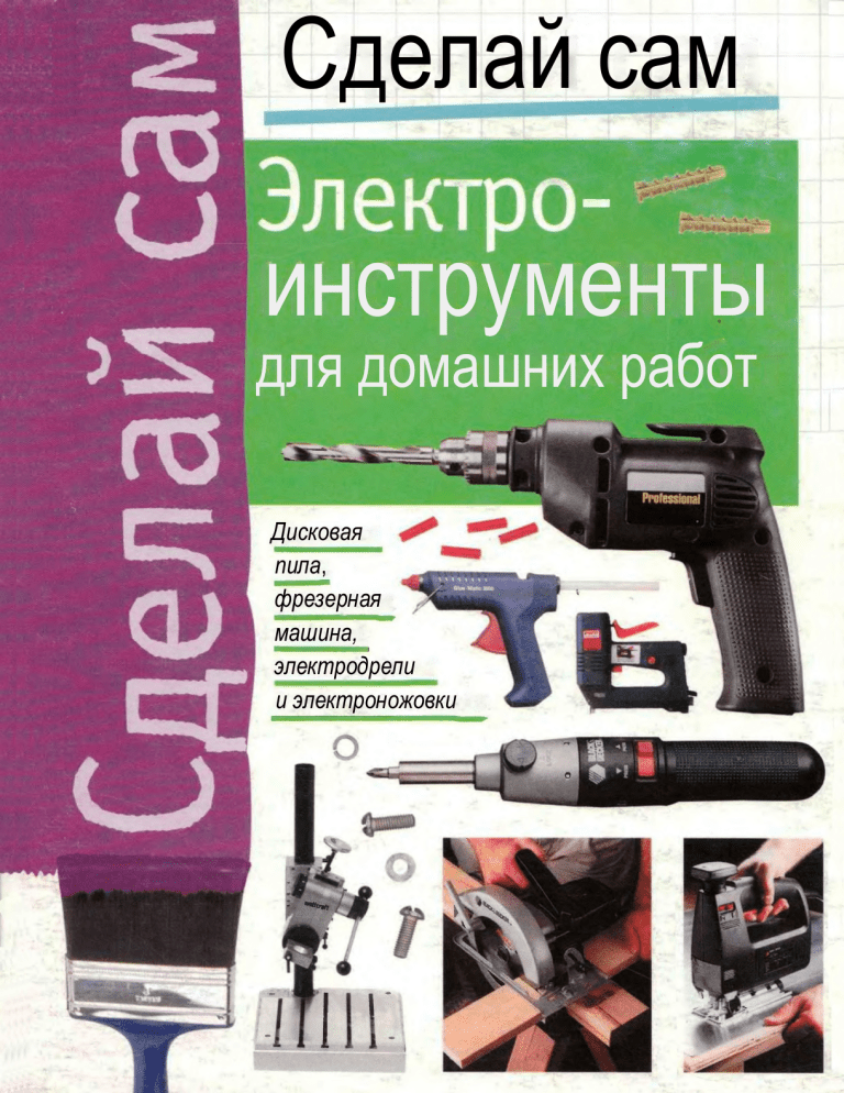 Сделай сам инструменты для домашних работ Дисковая пила, фрезерная машина, электродрели и электроножовки СЕРИЯ “СДЕЛАЙ САМ” Электроинструменты для домашних работ ВМЕШСИГМА ЛСТ • москвл 2000 ЭЛЕКТРОИНСТРУМЕНТЫ Настольная дисковая пила Прежде чем приступать к работе со стационарной дисковой пилой, ко­ торую устанавливают под специ­ альным рабочим столом, домаш­ ний мастер должен усвоить опре­ деленные правила - несколько от­ личные от тех, которые надлежит соблюдать при работе с дисковой пилой, управляемой вручную. Хотя принцип действия обоих инструментов одинаков, но суть в том, что со стационарным руки ма­ стера не соприкасаются: режущий диск выступает над столом на ту или иную высоту, и к нему подво­ дят деревянную деталь. Если ра­ боту вести небрежно, могут воз­ никнуть опасные ситуации. И не только от того, что часто руки ока­ зываются в непосредственной близости к быстро вращающемуся пилящему диску: обрезки дерева иногда прижимаются диском к 2 Настольная дисковая пила, безусловно, удобнее в эксплуатации, чем аналогичная пила с ручным управлением, поскольку подводить деталь к режущему диску легче, чем вести пилу. Однако при работе с настольной дисковой пилой надо соблюдать предельную осторож­ ность. В этой главе мы расскажем о приемах безопасного обращения с данным инструментом. кромке щели в рабочем столе и за­ тем вылетают оттуда с огромной скоростью, что может иметь мало­ приятные последствия. Безопасность прежде всего Для обеспечения собственной без­ опасности и повышения качества изготавливаемых изделий профес­ сиональные столяры и опытные любители используют в своей ра­ боте разнообразные приспособле­ ния и хорошо зарекомендовавшие себя приемы. О них, правда, мало что можно прочитать в существую­ щих инструкциях по применению дисковых пил. Чтобы начинающим столярам не пришлось тратить деньги на специальное обучение, мы даем здесь некоторые советы, почерпнутые из практики столяров-профессионалов. Защитный кожух позволяет удер­ живать руки на безопасном рас­ стоянии от пилящего диска ; щелевой клин препятствует за­ щемлению детали. Настольная дисковая пила - один из самых опасных инструментов в мастерской. Вращающийся со ско­ ростью более 4000 оборотов в ми­ нуту диск с острейшими зубьями, число которых доходит до 112, мо­ жет прямо или косвенно стать при­ чиной несчастного случая. Прямо, когда пальцы оказываются в непо­ средственной близости к диску; косвенно, когда защемляется заго­ товка или выбрасываются потоком воздуха обрезки дерева. Защитой от подобных опасных ситуаций служат щелевой клин и защитный кожух, которые входят в комплект каждой настольной дис­ ковой пилы. Некоторые дисковые пилы дополнительно оснащены предохранительной муфтой, кото­ рая защищает машину и работаю­ щего с ней в случае внезапно воз­ никшей блокировки. Щелевой клин, расположенный за пилящим диском и на одной с ним оси, предохраняет от попада­ ния в щель отрезанных частей де­ тали. Расстояние от клина до дис­ ка должно быть небольшим, чтобы обеспечивалась оптимальная от­ крытость щели. При установке на рабочем столе для дисковой пилы углового упора не следует целиком полагаться на шкалу с градусным делением: час­ то отлитые или отштампованные метки бывают неточны, что под­ тверждает проверка с помощью обычного чертежного