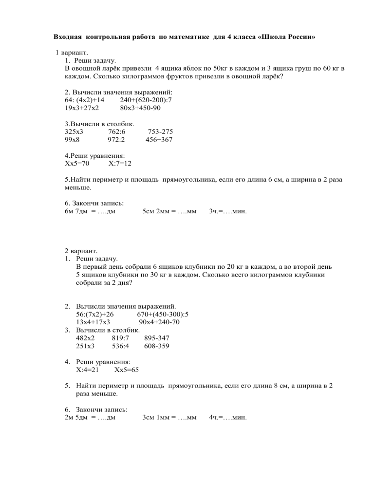 Входная контрольная работа по математике для 4 класса «Школа России» 1 вариант. 1. Реши задачу. В овощной ларёк привезли 4 ящика яблок по 50кг в каждом и 3 ящика груш по 60 кг в каждом. Сколько килограммов фруктов привезли в овощной ларёк? 2. Вычисли значения выражений: 64: (4х2)+14 240+(620-200):7 19х3+27х2 80х3+450-90 3.Вычисли в столбик. 325х3 762:6 99х8 972:2 753-275 456+367 4.Реши уравнения: Хх5=70 Х:7=12 5.Найти периметр и площадь прямоугольника, если его длина 6 см, а ширина в 2 раза меньше. 6. Закончи запись: 6м 7дм = ….дм 5см 2мм = ….мм 3ч.=….мин. 2 вариант. 1. Реши задачу. В первый день собрали 6 ящиков клубники по 20 кг в каждом, а во второй день 5 ящиков клубники по 30 кг в каждом. Сколько всего килограммов клубники собрали за 2 дня? 2. Вычисли значения выражений. 56:(7х2)+26 670+(450-300):5 13х4+17х3 90х4+240-70 3. Вычисли в столбик. 482х2 819:7 895-347 251х3 536:4 608-359 4. Реши уравнения: Х:4=21 Хх5=65 5. Найти периметр и площадь прямоугольника, если его длина 8 см, а ширина в 2 раза меньше. 6. Закончи запись: 2м 5дм = ….дм 3см 1мм = ….мм 4ч.=….мин.