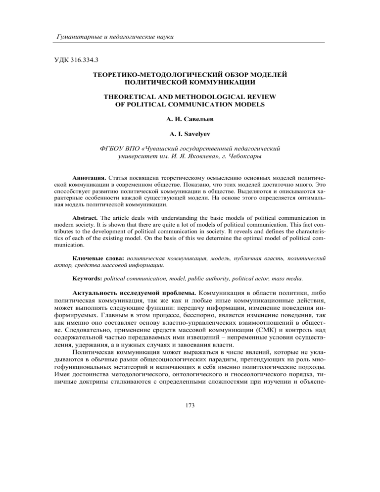 Гуманитарные и педагогические науки УДК 316.334.3 ТЕОРЕТИКО-МЕТОДОЛОГИЧЕСКИЙ ОБЗОР МОДЕЛЕЙ ПОЛИТИЧЕСКОЙ КОММУНИКАЦИИ THEORETICAL AND METHODOLOGICAL REVIEW OF POLITICAL COMMUNICATION MODELS А. И. Савельев A. I. Savelyev ФГБОУ ВПО «Чувашский государственный педагогический университет им. И. Я. Яковлева», г. Чебоксары Аннотация. Статья посвящена теоретическому осмыслению основных моделей политической коммуникации в современном обществе. Показано, что этих моделей достаточно много. Это способствует развитию политической коммуникации в обществе. Выделяются и описываются характерные особенности каждой существующей модели. На основе этого определяется оптимальная модель политической коммуникации. Abstract. The article deals with understanding the basic models of political communication in modern society. It is shown that there are quite a lot of models of political communication. This fact contributes to the development of political communication in society. It reveals and defines the characteristics of each of the existing model. On the basis of this we determine the optimal model of political communication. Ключевые слова: политическая коммуникация, модель, публичная власть, политический актор, средства массовой информации. Keywords: political communication, model, public authority, political actor, mass media. Актуальность исследуемой проблемы. Коммуникация в области политики, либо политическая коммуникация, так же как и любые иные коммуникационные действия, может выполнять следующие функции: передачу информации, изменение поведения информируемых. Главным в этом процессе, бесспорно, является изменение поведения, так как именно оно составляет основу властно-управленческих взаимоотношений в обществе. Следовательно, применение средств массовой коммуникации (СМК) и контроль над содержательной частью передаваемых ими извещений – непременные условия осуществления, удержания, а в нужных случаях и завоевания власти. Политическая коммуникация может выражаться в числе явлений, которые не укладываются в обычные рамки общесоциологических парадигм, претендующих на роль многофункциональных метатеорий и включающих в себя именно политологические подходы. Имея достоинства методологического, онтологического и гносеологического порядка, типичные доктрины сталкиваются с определенными сложностями при изучении и объясне- 173 Вестник ЧГПУ им. И. Я. Яковлева. 2013. № 1 (77). Ч. 1 нии коммуникационных феноменов, которые стали неотъемлемой частью современного мира. В условиях развития информационного социума анализ спорных вопросов борьбы за власть смещается от традиционной постановки вопроса о власти и собственности на средства материального производства в плоскость борьбы за власть и собственность на средства производства социального представления. Этим обусловлена необходимость пересмотра устоявшегося представления о «четвертой власти» и трактовки его уже не столько в иносказательном, сколько в констатирующем и конституирующем смысле. Материал и методика исследований. Методологическая основа исследования представляет собой многоуровневый комплекс принципов и методов познания, присущих современной науке. Основой изучения проблемы, решения поставленных задач явилось применение принципов историзма, системности, сравнения, диалектичности единства теоретического и эмпирического, а также концептуальные положения институциональной, функциональной, социокультурной и коммуникативной теорий. Результаты исследований и их обсуждение. Существует достаточно большое число научных иссле