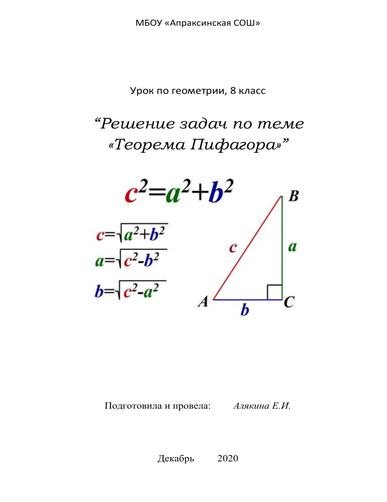 МБОУ «Апраксинская СОШ» Урок по геометрии, 8 класс “Решение задач по теме «Теорема Пифагора»” Подготовила и провела: Декабрь Алякина Е.И. 2020 Решение задач по теме: «Терема Пифагора» Цель урока: Применение теоремы Пифагора при решении задач. Задачи: Обобщить и систематизировать знания учащихся по теме. Развивать внимание учащихся, логическое мышление, математическую речь. Прививать интерес к предмету геометрия. Тип урока: урок обобщения и закрепления полученных знаний. Формы работы на уроке: фронтальная, индивидуальная, самостоятельная. Оборудование: компьютер; мультимедийный проектор; презентация к уроку. Ход урока 1. Мотивационно-организационный этап. Приветствие, проверка готовности к уроку (рабочих тетрадей, учебников, письменных принадлежностей). - Ребята, мы продолжаем изучать одну из самых известных теорем, теорему Пифагора. Значение теоремы Пифагора состоит в том, что с её помощью можно доказать многие другие теоремы и решить множество задач. Ещё в 17 веке немецкий астроном и математик И. Кеплер сказал, что геометрия обладает двумя великими сокровищами. Первое – это теорема Пифагора, которую можно сравнить с мерой золота. А второе – деление отрезка в крайнем и среднем отношении, которое напоминает драгоценный камень. Древнегреческий философ и математик (VI в до н.э.) Пифагор – едва ли не самый популярный за всю историю человечества. Вокруг его личности образовалось множество легенд. Одни его называли математиком, пророком, философом, другие шарлатаном. Пифагор много путешествовал. Пифагор основал школу «Пифагорийский союз», в школу принимались молодые представители аристократии, с большими церемониями, после долгих испытаний. Каждый вступающий отрекался от своего имущества и давал клятву хранить в тайне учения основателя. Пифогорийцы занимались математикой, философией, естественными науками, сделали много важных открытий в арифметике и геометрии. Но в школе существовал Декрет, по которому авторство всех математических работ приписывалось Пифагору. Напомните, пожалуйста. формулировку теоремы Пифагора. (В прямоугольном треугольнике квадрат гипотенузы равен сумме квадратов катетов) А обратная теорема? Доказательство теоремы называли «мостом ослов», т.к. слабые ученики, заучивающие теоремы наизусть, без понимания, и прозванные поэтому «ослами», были не в состоянии преодолеть теорему Пифагора, служащую для них вроде непреодолимого моста. Или «бегство убогих», т.к. некоторые «убогие» ученики, не имевшие серьезной математической подготовки, бежали от геометрии. Саму теорему называли «ветряной мельницей», «теоремой – бабочкой» или «теоремой невесты». Известно около 150, а по некоторым источникам около 500 различных доказательств теоремы Пифагора, поэтому она занесена в книгу рекордов Гиннеса. Однако эту теорему знали за много лет до Пифагора. Так, за 1500 лет до Пифагора древние египтяне знали о том, что треугольник со сторонами 3, 4и 5 является прямоугольным и применяли этот способ для строительства пирамид.В самом древнем индийском геометрическом сборнике «Сульвасутра» («Правила веревки, 600 год до н.э.) даются правила построения прямых углов при помощи веревки с узлами, расстояния между которыми равны 15, з6 и з9 падас (мера длины). В Древнем Китае уже около 2200г. до н.э. для треуголдьника со стороной 3, 4, 5 было найдено прав