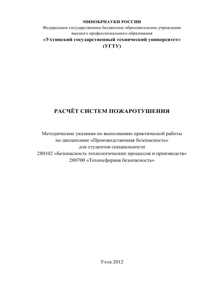 МИНОБРНАУКИ РОССИИ Федеральное государственное бюджетное образовательное учреждение высшего профессионального образования «Ухтинский государственный технический университет» (УГТУ) РАСЧЁТ СИСТЕМ ПОЖАРОТУШЕНИЯ Методические указания по выполнению практической работы по дисциплине «Производственная безопасность» для студентов специальности 280102 «Безопасность технологических процессов и производств» 280700 «Техносферная безопасность» Ухта 2012 УДК 614.843 (076.5) ББК 38.96 Я7 К 60 Колесник, О. А. Расчёт систем пожаротушения [Текст] : метод. указания по выполнению практической работы / О. А. Колесник, А. Г. Бердник. – Ухта : УГТУ, 2012. – 27 с. Методические указания по выполнению практической работы по дисциплине «Производственная безопасность» предназначены для студентов специальности 280102 «Безопасность технологических процессов и производств» и 280700 «Техносферная безопасность». Методические указания рассмотрены и одобрены кафедрой ПБ и ООС пр отокол № 03 от 11.11.2011 г. Рецензент: В. П. Перхуткин, доцент кафедры ПБ и ООС Ухтинского государственного технического университета, канд.техн.наук, доцент. Редактор: О. В. Дегтярева, ассистент кафедры ПБ и ООС Ухтинского государственного технического университета. В методических указаниях учтены замечания рецензента и редактора. План 2011 г., позиция 95. Подписано в печать 30.12.2011 г. Компьютерный набор. Объём 27 с. Тираж 100 экз. Заказ № 260. © Ухтинский государственный технический университет, 2012 169300, Республика Коми, г. Ухта, ул. Первомайская, д. 13 Типография УГТУ. 169300, Республика Коми, г. Ухта, ул. Октябрьская, д. 13 СОДЕРЖАНИЕ Введение ....................................................................................................... 3 1 Расчёт системы пожаротушения высокократной пеной .......................... 6 2 Расчет системы пожаротушения резервуаров с помощью гидромониторов ...................................................................... 10 3 Расчет системы охлаждения .................................................................... 12 4 Расчет системы пожаротушения открытых технологических установок ....................................................................... 14 5 Расчет системы подслойного пожаротушения резервуаров .................. 16 Задание для практической работы ............................................................. 23 Библиографический список ....................................................................... 27 ВВЕДЕНИЕ Основным средством тушения нефти и нефтепродуктов в резервуарных парках является воздушно-механическая пена средней и низкой кратности. Кратность пены – отношение объема пены к объему раствора пенообразователя, содержащегося в ней. В зависимости от величины кратности пену подразделяют: на пену низкой кратности (кратность не более 20); пену средней кратности (кратность от 20 до 200); пену высокой кратности (кратность более 200). Огнетушащее действие воздушно-механической пены заключается в изоляции поверхности горючего от факела пламени, снижении вследствие этого скорости испарения жидкости и сокращении количества горючих паров, поступающих в зону горения, а также в охлаждении горящей жидкости. Роль каждого из этих факторов в процессе тушения изменяется в зависимости от свойств горящей жидкости, качества пены и способа ее подачи. При подаче пены одновременно происходит разрушение пены от факела пламени и нагретой поверхности горючего. Накапливающийся слой пены экранирует часть поверхности горючего от лучистого теплового потока пламени, уменьшает количество паров
