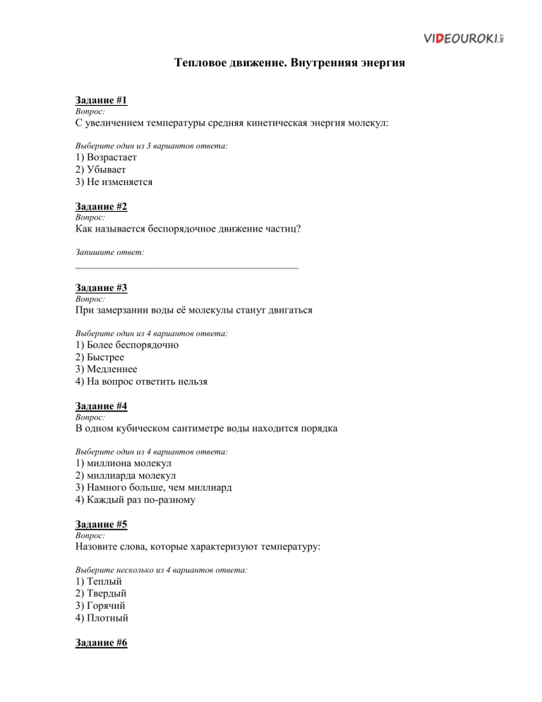 Тепловое движение. Внутренняя энергия Задание #1 Вопрос: С увеличением температуры средняя кинетическая энергия молекул: Выберите один из 3 вариантов ответа: 1) Возрастает 2) Убывает 3) Не изменяется Задание #2 Вопрос: Как называется беспорядочное движение частиц? Запишите ответ: __________________________________________ Задание #3 Вопрос: При замерзании воды её молекулы станут двигаться Выберите один из 4 вариантов ответа: 1) Более беспорядочно 2) Быстрее 3) Медленнее 4) На вопрос ответить нельзя Задание #4 Вопрос: В одном кубическом сантиметре воды находится порядка Выберите один из 4 вариантов ответа: 1) миллиона молекул 2) миллиарда молекул 3) Намного больше, чем миллиард 4) Каждый раз по-разному Задание #5 Вопрос: Назовите слова, которые характеризуют температуру: Выберите несколько из 4 вариантов ответа: 1) Теплый 2) Твердый 3) Горячий 4) Плотный Задание #6 Вопрос: Кинетическая и потенциальная энергия относятся к следующим видам явлений: Выберите один из 4 вариантов ответа: 1) Электрические явления 2) Световые явления 3) Механические явления 4) Тепловые явления Задание #7 Вопрос: Летящий мяч: Выберите один из 4 вариантов ответа: 1) Обладает кинетической энергией 2) Обладает потенциальной энергией 3) Не обладает ни той, ни другой энергией 4) Обладает и той и другой энергией Задание #8 Вопрос: Внутренняя энергия тела НЕ зависит от: Выберите несколько из 4 вариантов ответа: 1) Кинетической энергии тела 2) Потенциальной энергии тела 3) Кинетической энергии молекул тела 4) Потенциальной энергии молекул тела Задание #9 Вопрос: Суммарная энергия тела НЕ зависит от: Выберите один из 5 вариантов ответа: 1) Скорости движения тела 2) Положения тела относительно других тел 3) Температуры тела 4) Местонахождения тела 5) Массы тела Задание #10 Вопрос: Сумма энергий половины молекул тела: Выберите один из 4 вариантов ответа: 1) Равна половине внутренней энергии тела 2) Больше половины внутренней энергии тела 3) Меньше половины внутренней энергии тела 4) На вопрос ответить нельзя Ответы: 1) (1 б.) Верные ответы: 1; 2) (1 б.) Верный ответ: "Тепловое". 3) (3 б.) Верные ответы: 3; 4) (1 б.) Верные ответы: 3; 5) (2 б.) Верные ответы: 1; 3; 6) (1 б.) Верные ответы: 3; 7) (1 б.) Верные ответы: 4; 8) (2 б.) Верные ответы: 1; 2; 9) (2 б.) Верные ответы: 4; 10) (1 б.) Верные ответы: 4; Конец