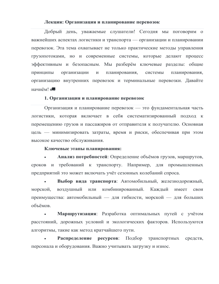 Лекция: Организация и планирование перевозок Добрый день, уважаемые слушатели! Сегодня мы поговорим о важнейших аспектах логистики и транспорта — организации и планировании перевозок. Эта тема охватывает не только практические методы управления грузопотоками, но и современные системы, которые делают процесс эффективным и безопасным. Мы разберём ключевые разделы: общие принципы организации и планирования, системы планирования, организацию внутренних перевозок и терминальные перевозки. Давайте начнём! 🚚 1. Организация и планирование перевозок Организация и планирование перевозок — это фундаментальная часть логистики, которая включает в себя систематизированный подход к перемещению грузов и пассажиров от отправителя к получателю. Основная цель — минимизировать затраты, время и риски, обеспечивая при этом высокое качество обслуживания. Ключевые этапы планирования: Анализ потребностей: Определение объёмов грузов, маршрутов, сроков и требований к транспорту. Например, для промышленных предприятий это может включать учёт сезонных колебаний спроса. морской, Выбор вида транспорта: Автомобильный, железнодорожный, воздушный или комбинированный. Каждый имеет свои преимущества: автомобильный — для гибкости, морской — для больших объёмов. Маршрутизация: Разработка оптимальных путей с учётом расстояний, дорожных условий и экологических факторов. Используются алгоритмы, такие как метод кратчайшего пути. Распределение ресурсов: Подбор транспортных персонала и оборудования. Важно учитывать загрузку и износ. средств, Мониторинг и корректировка: Непрерывный контроль с использованием GPS и систем отслеживания для оперативных изменений. Планирование должно учитывать внешние факторы, такие как законодательство, экономика и экология. Без грамотной организации перевозки могут привести к простоям, потерям и увеличению расходов. 2. Системы планирования перевозок Современные системы планирования перевозок — это цифровые инструменты, которые автоматизируют и оптимизируют процесс. Они основаны на программном обеспечении и ИТ-технологиях, позволяя обрабатывать большие объёмы данных в реальном времени. Основные типы систем: TMS (Transportation Management Systems): Системы управления транспортом, такие как SAP TM или Oracle Transportation Они Management. помогают в планировании маршрутов, выборе перевозчиков и отслеживании грузов. Преимущества: снижение затрат на 10– 20% за счёт оптимизации. WMS (Warehouse Management Systems): Интегрированные системы для складов, которые синхронизируют внутренние и внешние перевозки. Пример — Manhattan Associates или Infor. GPS и IoT-системы: Устройства для отслеживания, такие как датчики температуры для скоропортящихся грузов или системы мониторинга топлива. AI и машинное обучение: Современные платформы, например, от компаний вроде Uber Freight, используют алгоритмы для предсказания спроса и динамического ценообразования. Эти системы экологичность. обеспечивают Например, они прозрачность, могут безопасность рассчитывать маршруты и с минимальным выбросом CO2. Однако внедрение требует инвестиций и обучения персонала. 3. Организация внутренних перевозок Организация внутренних перевозок относится к перемещению грузов внутри предприятия, города или региона. Это включает логистику на заводах, складах или в рамках городского транспорта. Особенности: Внутрипроизв