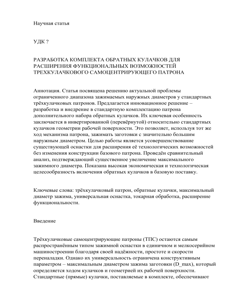 Научная статья УДК ? РАЗРАБОТКА КОМПЛЕКТА ОБРАТНЫХ КУЛАЧКОВ ДЛЯ РАСШИРЕНИЯ ФУНКЦИОНАЛЬНЫХ ВОЗМОЖНОСТЕЙ ТРЕХКУЛАЧКОВОГО САМОЦЕНТРИРУЮЩЕГО ПАТРОНА Аннотация. Статья посвящена решению актуальной проблемы ограниченного диапазона зажимаемых наружных диаметров у стандартных трёхкулачковых патронов. Предлагается инновационное решение – разработка и внедрение в стандартную комплектацию патрона дополнительного набора обратных кулачков. Их ключевая особенность заключается в инвертированной (перевёрнутой) относительно стандартных кулачков геометрии рабочей поверхности. Это позволяет, используя тот же ход механизма патрона, зажимать заготовки с значительно большим наружным диаметром. Целью работы является усовершенствование существующей оснастки для расширения её технологических возможностей без изменения конструкции базового патрона. Проведён сравнительный анализ, подтверждающий существенное увеличение максимального зажимного диаметра. Показана высокая экономическая и технологическая целесообразность включения обратных кулачков в базовую поставку. Ключевые слова: трёхкулачковый патрон, обратные кулачки, максимальный диаметр зажима, универсальная оснастка, токарная обработка, расширение функциональности. Введение Трёхкулачковые самоцентрирующие патроны (ТПС) остаются самым распространённым типом зажимной оснастки в единичном и мелкосерийном машиностроении благодаря своей надёжности, простоте и скорости переналадки. Однако их универсальность ограничена конструктивным параметром – максимальным диаметром зажима заготовки (D_max), который определяется ходом кулачков и геометрией их рабочей поверхности. Стандартные (прямые) кулачки, поставляемые в комплекте, обеспечивают зажим в диапазоне от минимального диаметра до D_max_стандарт, значение которого близко к номинальному размеру патрона. На практике часто возникает необходимость обработки заготовок (дисков, фланцев, маховиков), наружный диаметр которых превышает D_max_стандарт. Традиционные решения – переход на патрон большего типоразмера, использование план-шайб или четырёхкулачковых патронов – ведут к росту капитальных затрат, увеличению времени наладки или потере производительности. Таким образом, существует объективная потребность в усовершенствовании существующих ТПС для расширения их диапазона без кардинальной замены оснастки. Цель и задачи исследования. Цель исследования – теоретическое и практическое обоснование разработки и применения комплекта обратных кулачков для стандартных трёхкулачковых патронов, позволяющих за счёт инвертированной геометрии рабочей поверхности существенно увеличить максимальный диаметр зажимаемой заготовки по наружной поверхности. Задачи исследования: 1) Анализ геометрии и кинематики зажима стандартных кулачков. 2) Расчетный анализ силового замыкания и создаваемого момента сжатия. 3) Разработка принципа действия и конструктивных параметров обратных кулачков. 4) Сравнительная оценка диапазонов зажима для стандартных и обратных кулачков на одной модели патрона. 5) Исследование потребности производства в подобном решении. 6) Оценка влияния на жесткость системы и надёжность зажима. 7) Принцип действия и конструкция обратных кулачков Ключевая идея разработки заключается в изменении ориентации рабочей (