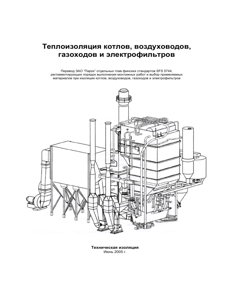 Теплоизоляция котлов, воздуховодов, газоходов и электрофильтров Перевод ЗАО “Парок” отдельных глав финских стандартов SFS 5744, регламентирующих порядок выполнения монтажных работ и выбор применяемых материалов при изоляции котлов, воздуховодов, газоходов и электрофильтров Техническая изоляция Июнь 2005 г. Монтаж теплоизоляции котлов, воздуховодов, газоходов и электрофильтров по нормам SFS 5744 2/32 Требования к проектированию котлов, электрофильтров, воздуховодов и газоходов. Монтажные размеры При проектировании усилительных и опорных конструкций для воздуховодов и фильтров, для предотвращения образования конденсата на внутренних поверхностях изолируемого оборудования, необходимо обратить особое внимание на меры по предотвращению распространения тепла. Необходимые производственные площади При планировании изоляционных работ необходимо учитывать температурные расширения смежных с изоляцией объектов. Заказчик работ должен предоставить заранее информацию о температурных смещениях оборудования подрядчику по установке изоляции, например, за 2 месяца до начала работ. Необходимо закладывать свободное расстояние (не менее 50 мм) между колонной, или другой опорной конструкцией, и покровным слоем, покрывающим изоляцию. Свободное расстояние для доступа между фланцами, смотровыми люками, и изолируемой поверхностью должно составлять номинальную толщину изоляции + 15 мм (или слой изоляции + пространство необходимое для опорной конструкции и покровного слоя). Другие факторы, которые необходимо учитывать. Пешеходные мостики и дорожки, подлежащие теплоизоляции, должны оборудоваться защитными покрытиями изоляции. Котлы-рекуператоры, котлы, работающие на сжигании торфа, и другие котельные, где необходимо мыть защитное покрытие изоляции, должны проектироваться таким образом, чтобы вода не попадала внутрь изоляции. Для защитных покрытий воздуховодов прямоугольного сечения, располагаемых как внутри так и снаружи здания, необходимо проектировать и строить водозащитные устройства и удаляющие воду приспособления. Подшипники запорных дисков и другого оборудования, в основном, не изолируются. При изоляции крыши и днища котла, на поверхности изоляции при температурах, не превышающих 450 ОС, в качестве армирования изоляционного мата применяется проволочная сетка из неоцинкованной углеродистой стали. При температурах 450 – 600 ОС армированная сетка должна изготавливаться из нержавеющей стали. Опорные конструкции необходимо проектировать с учетом воздействия на них тепла со стороны других разогретых поверхностей, таких, например, как коллекторы котельной установки. Температура вблизи опорных конструкций не должна превышать принятые нормы безопасности. При выборе покровного слоя необходимо учитывать участки высокой температуры (штуцеры, опоры, смотровые окна). На участках, где покровный слой соприкасается с коррозийно-активной средой, должны применяться коррозийно-устойчивые материалы. Монтаж теплоизоляции котлов, воздуховодов, газоходов и электрофильтров по нормам SFS 5744 3/32 Если строительство объекта планируется вне помещения, необходимо учитывать воздействие ветра и снега. При проектировании армирования воздуховодов необходимо учитывать стандартную ширину изоляционных материалов: 600 мм, 900 мм, 1200 мм, 1500 мм и 1800 мм. Если то